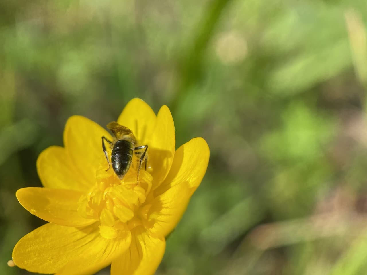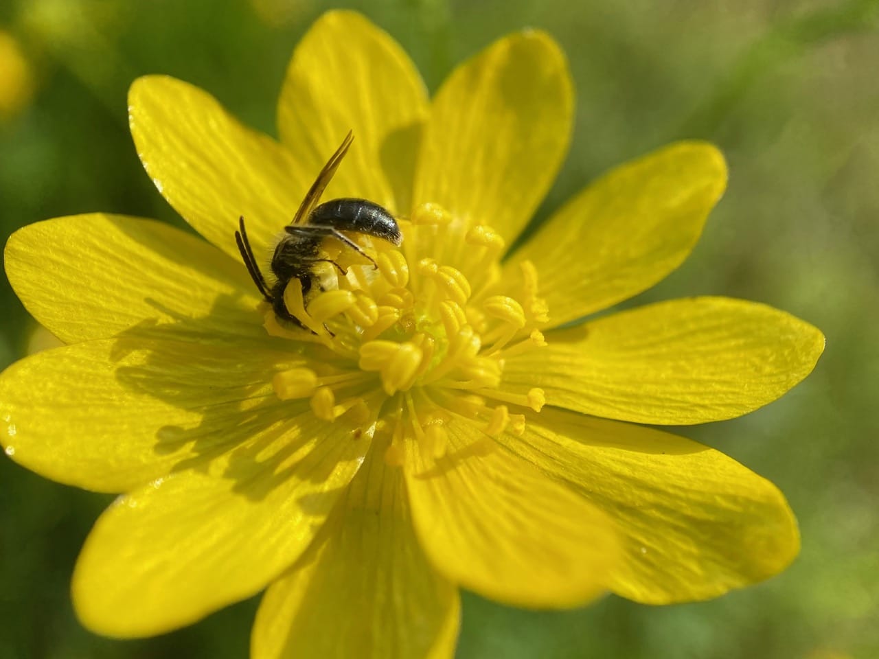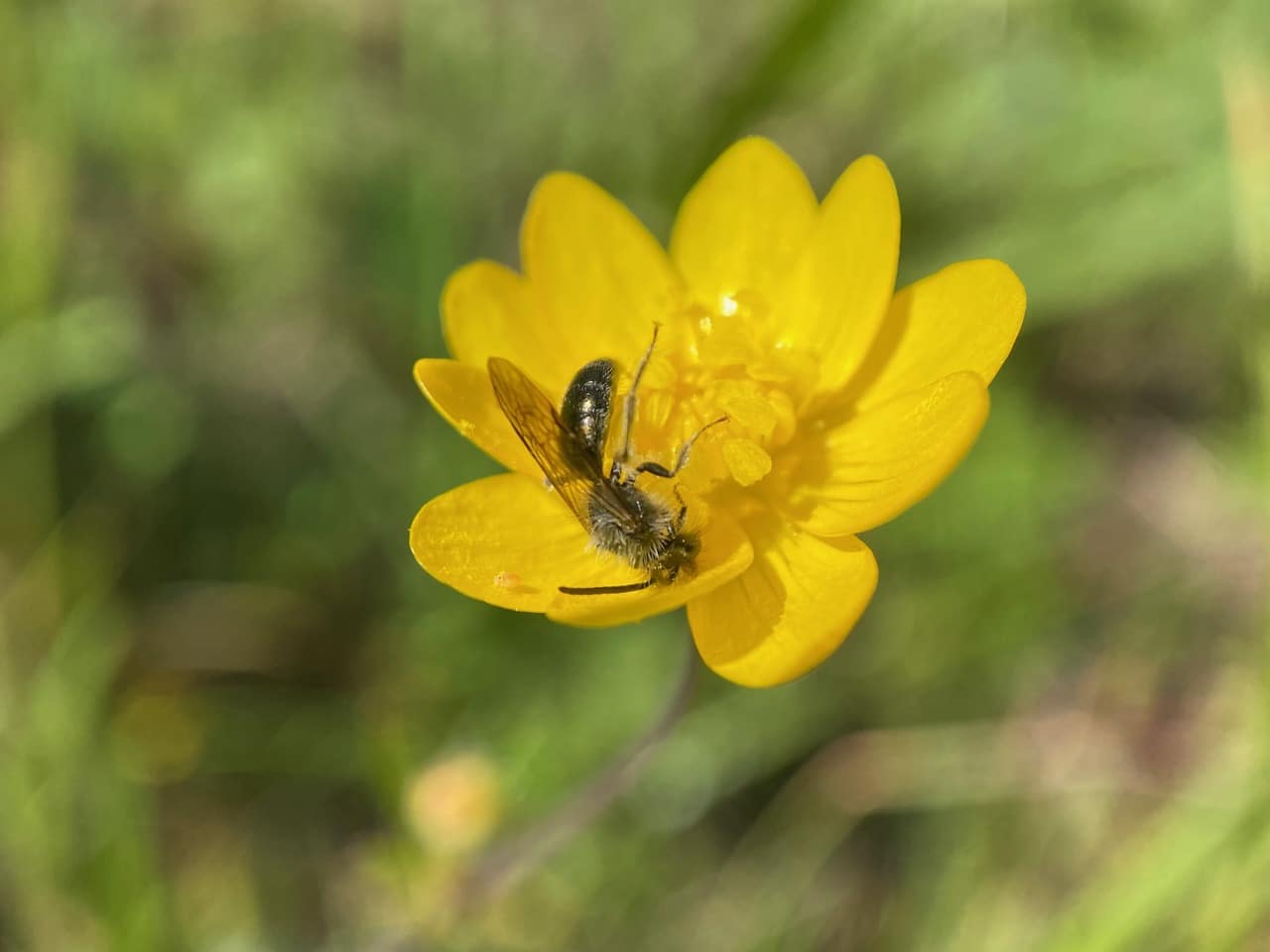The bee next visits an older buttercup flower with spent stamens (with no pollen), and swelling green carpels in the middle of the flower.