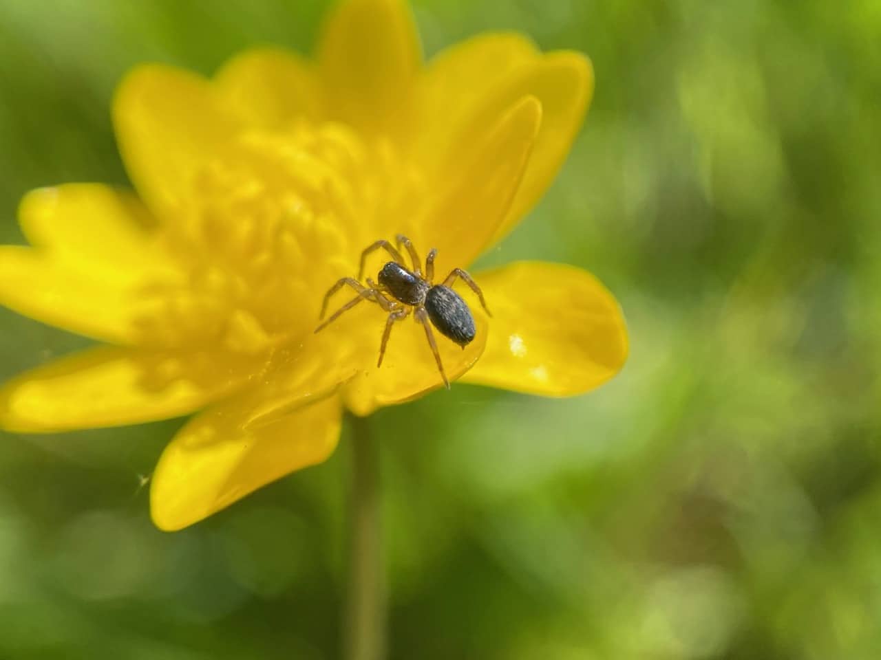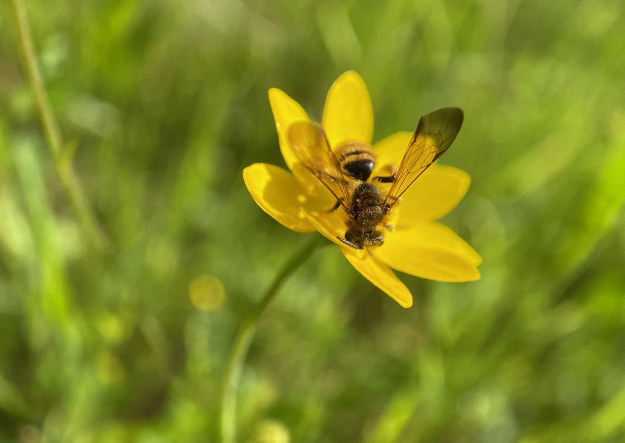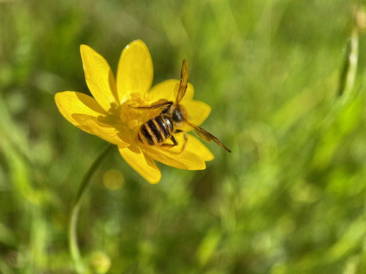 The bee next visits an older buttercup flower with spent stamens (with no pollen), and swelling green carpels in the middle of the flower.