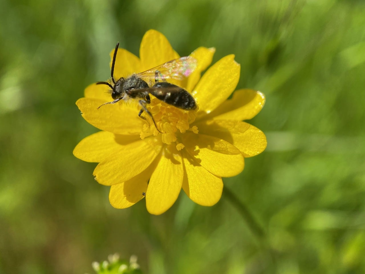A male Miner Bee, Andrena sp. (family Andrenidae) is taking nectar from a buttercup flower. Note his slender build and long antennae, and the absence of scopae on his hind legs.