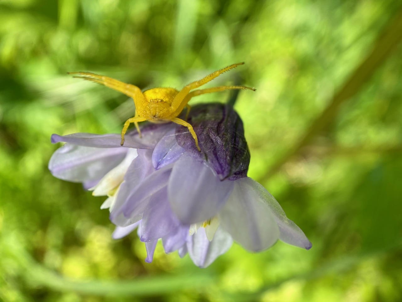 Its two front pairs of legs raised, a large Crab Spider, Misumena vatia (family Thomisidae) is on full alert on a cluster of Blue Dicks flowers, Dipterostemon capitatus. In bright yellow, the ambush predator is quite visible against the blue flowers. How does she expect any potential prey to come close?