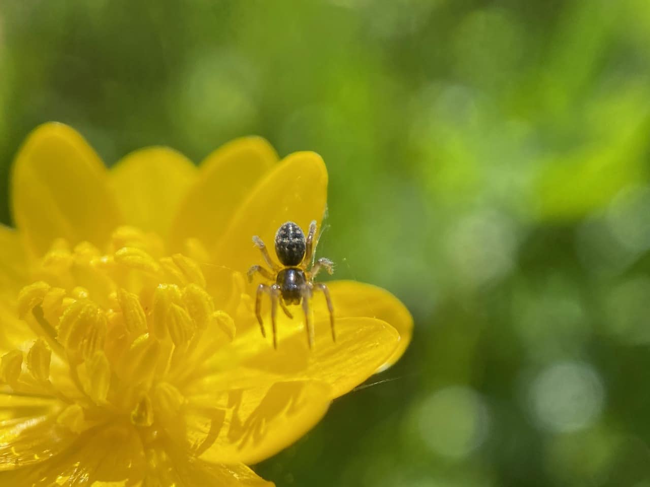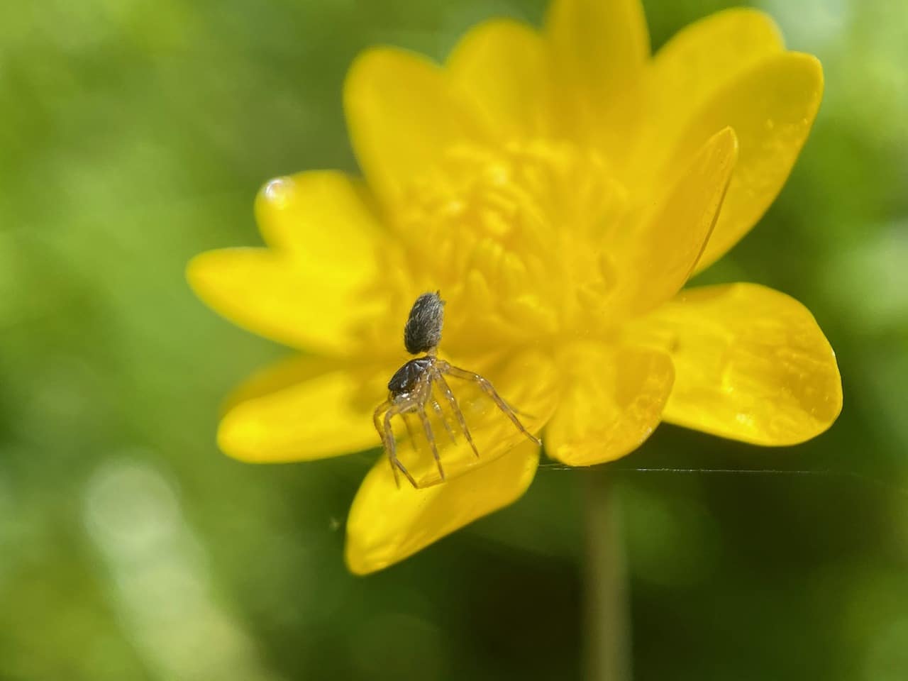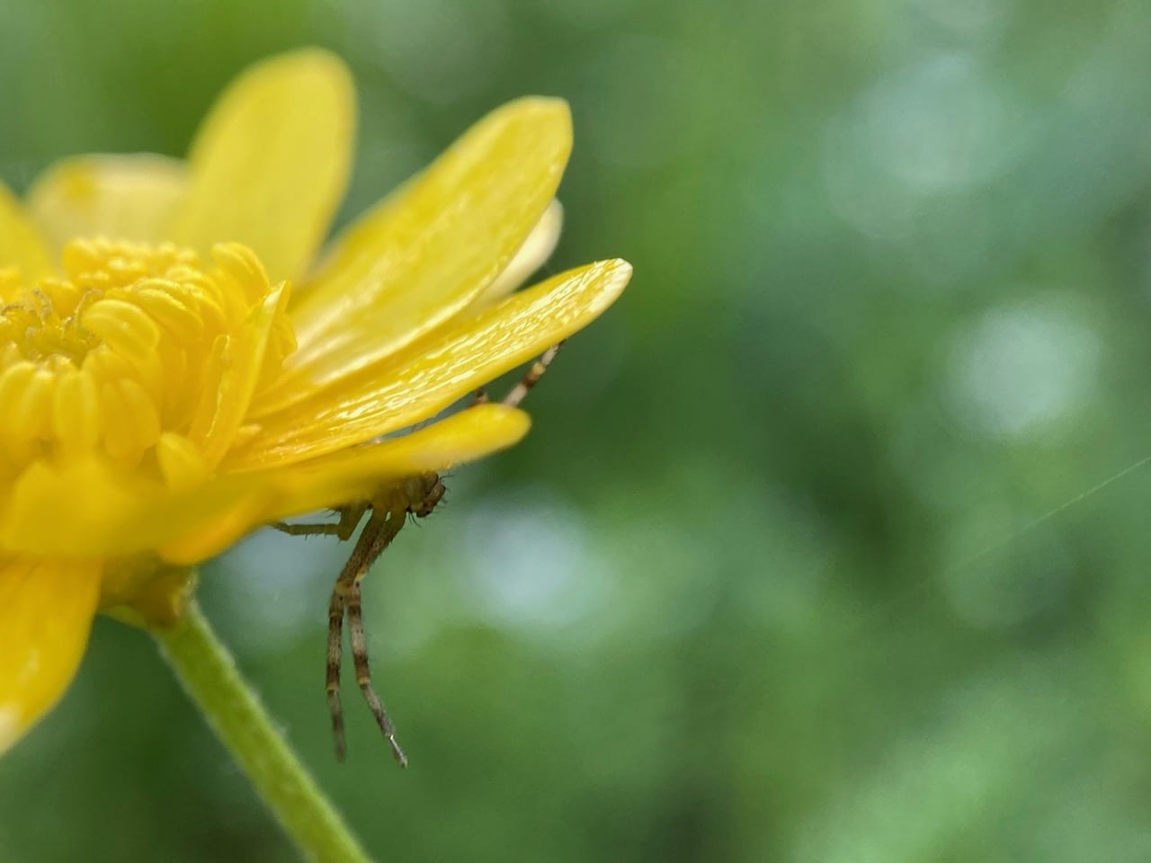 Its front legs fully outstretched, a tiny Crab Spider (family Thomisidae) is waiting in ambush under a buttercup flower.