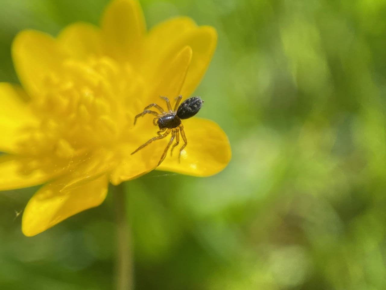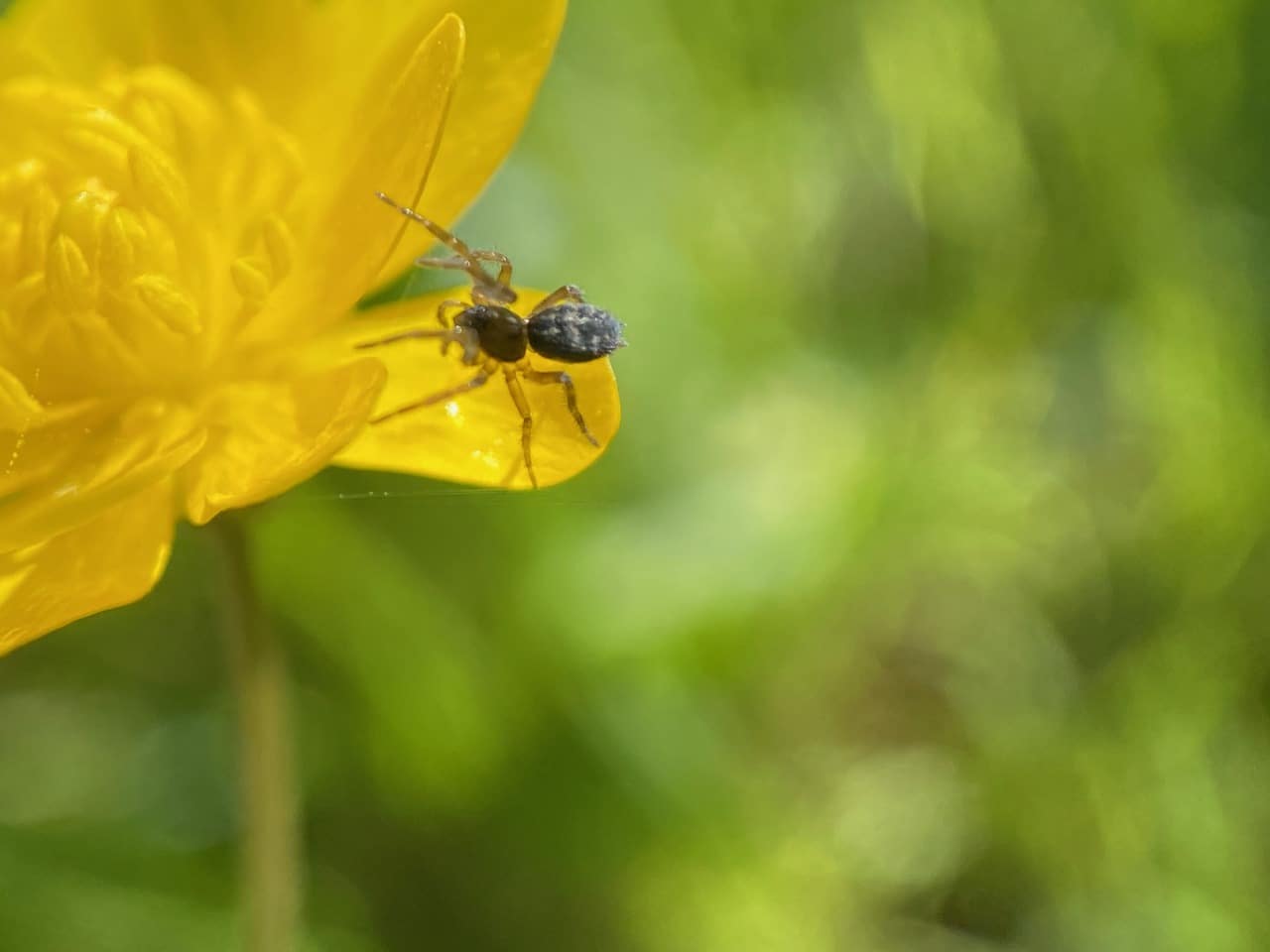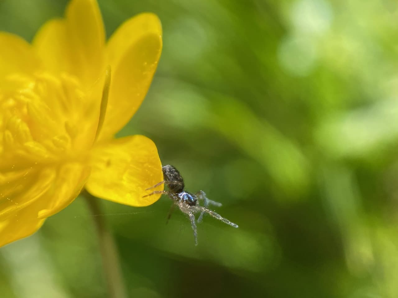 Its front legs fully outstretched, a tiny Crab Spider (family Thomisidae) is waiting in ambush under a buttercup flower.