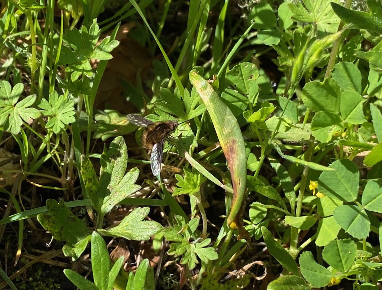 After probing for nectar from a flower of Blue Dicks, a Greater Bee Fly, Bombylius major (family Bombyliidae) lands on the vegetation in the undergrowth, almost disappearing completely.