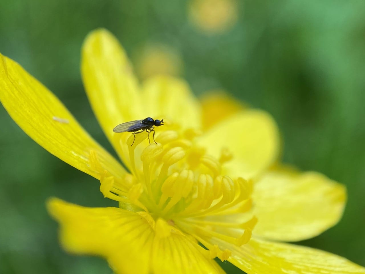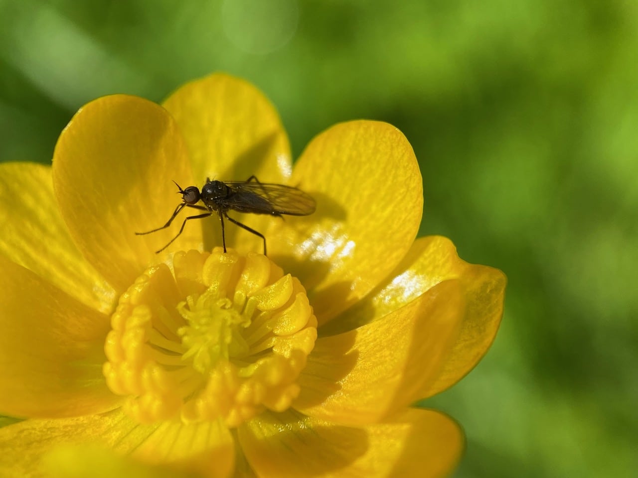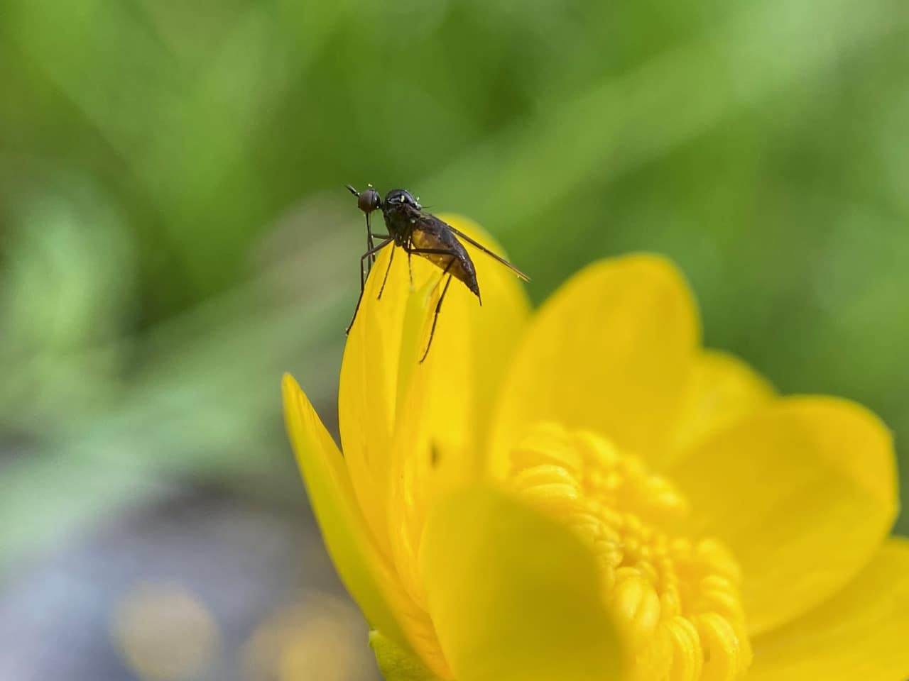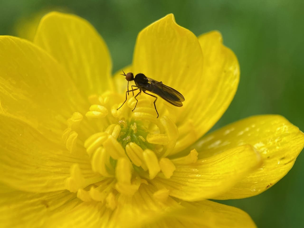 A female Dance Fly (superfamily Empidoidea) is perched at the edge of a buttercup petal. She has some pollen grains stuck to her head and thorax.