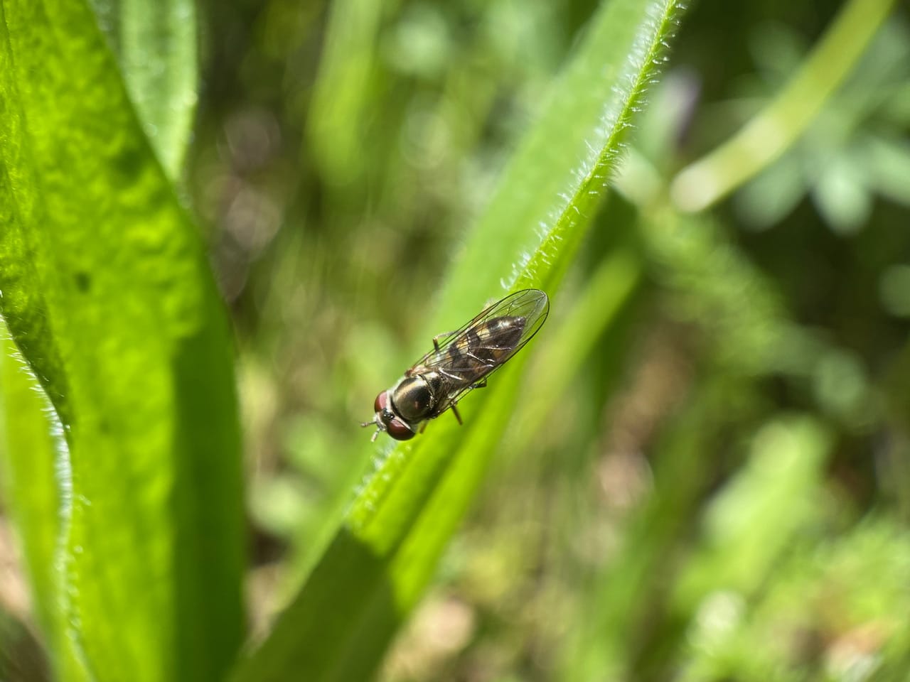 Many species of Hover Flies exhibit Batesian mimicry; they are brightly colored, with bands of yellow resembling the bees and wasps. The mimicry provides the fly with some measure of protection from potential predators, although the flies are harmless and lack a sting.