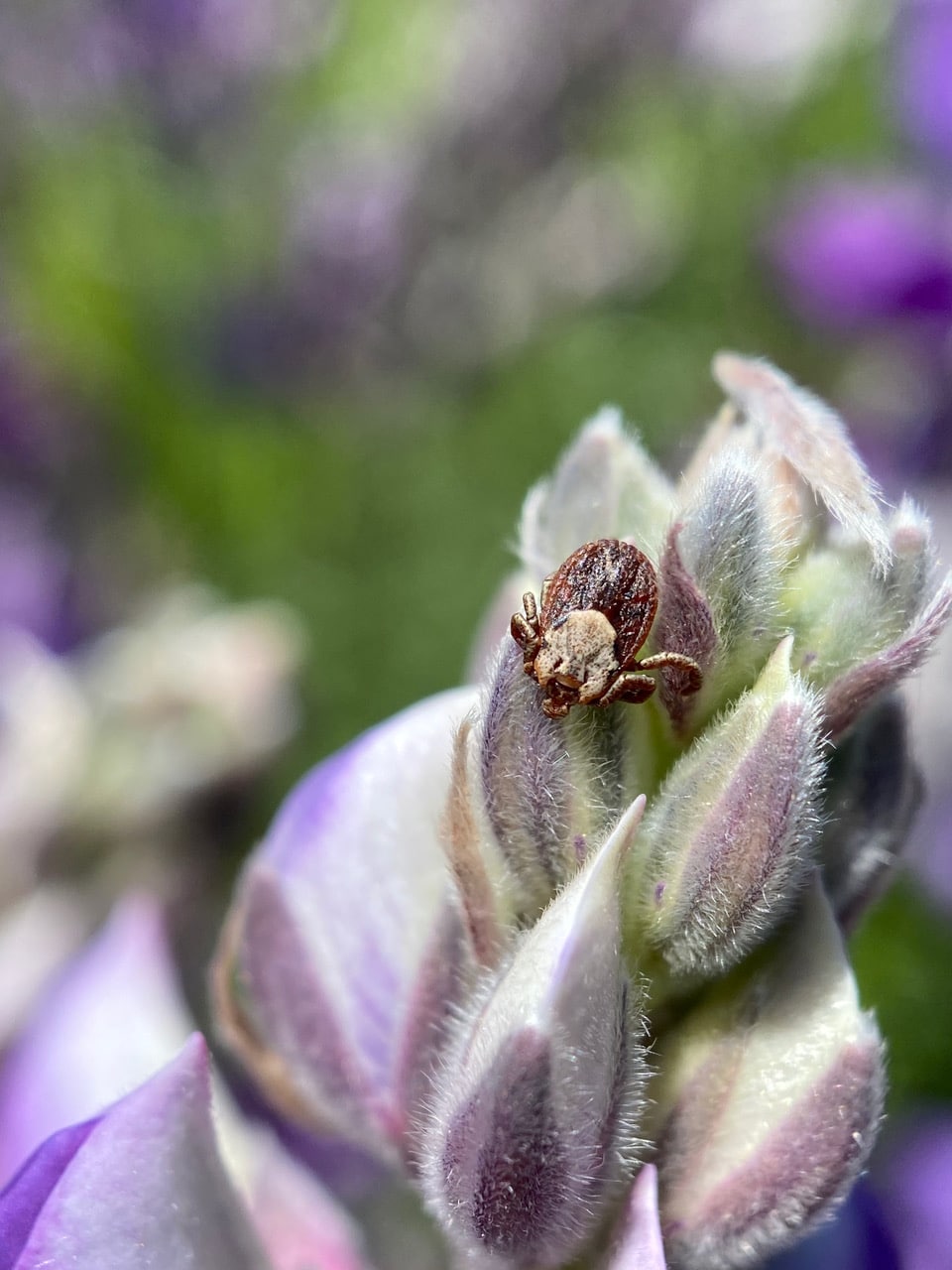 An adult female Pacific Coast Tick, Dermacentor occidentalis is clinging on a Silverleaf Lupine inflorescence by the trail. This species is widely distributed throughout California except for the very arid areas of the central valley and south eastern desert region. The immature stages feed on rodents, especially squirrels, while the adults prefer large mammals such as cattle, horses, deer and humans.