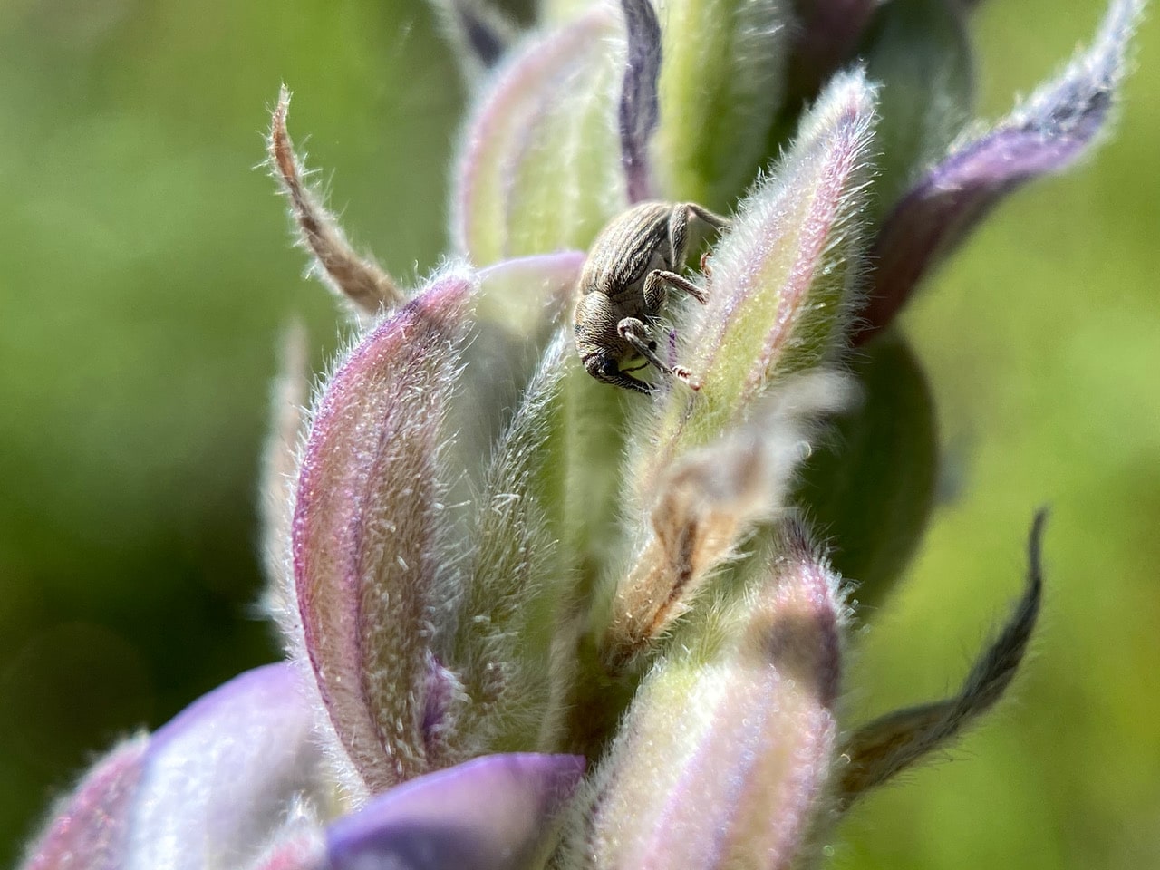 Another beetle is hunched over, feeding on a Silverleaf Lupine flower bud. It is a weevil in the genus Tychius (family Curculiondae) or leguminous seed weevil. The weevils feed on various plants in the pea or Fabaceae family; larvae feed on reproductive parts.