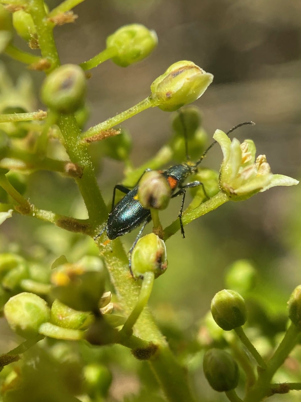 A small but attractively iridescent Flower Longhorn Beetle, Grammoptera militaris is moving around among the flowers of Poison Oak.