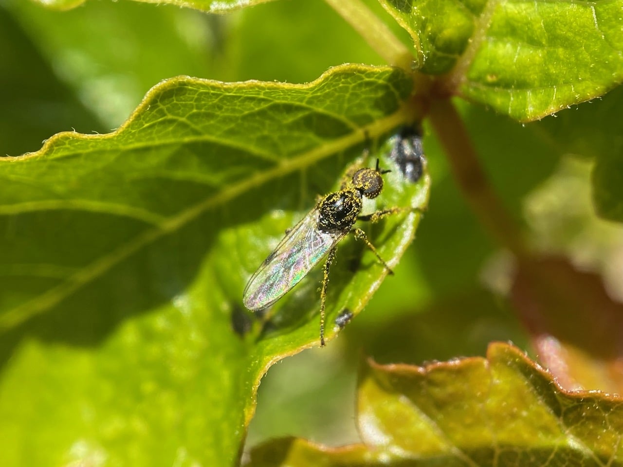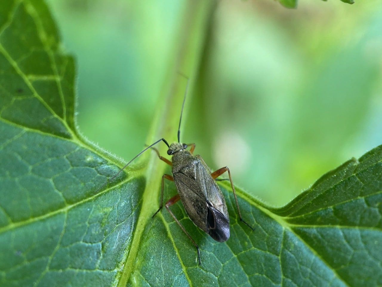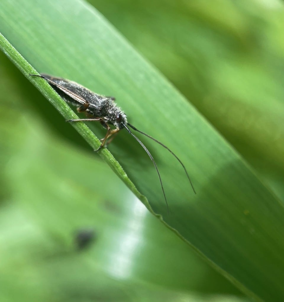 A Black Grass Bug, Irbisia sp. (family Miridae) is perched on a leaf. In the shade the bugs appear black, but where well lit, the scales on their body shine a dazzling bronze.