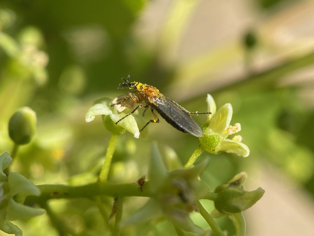 I wait for some of the insects to land. Ah, these are March Flies, Dilophus sp. (family Bibionidae). This male already has some pollen scattered over his body.