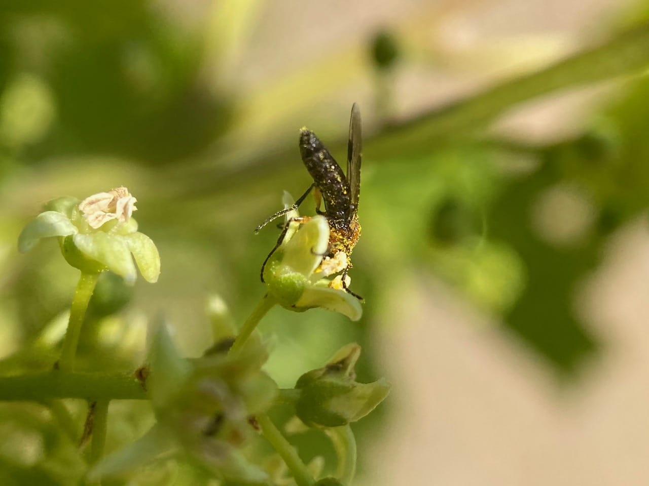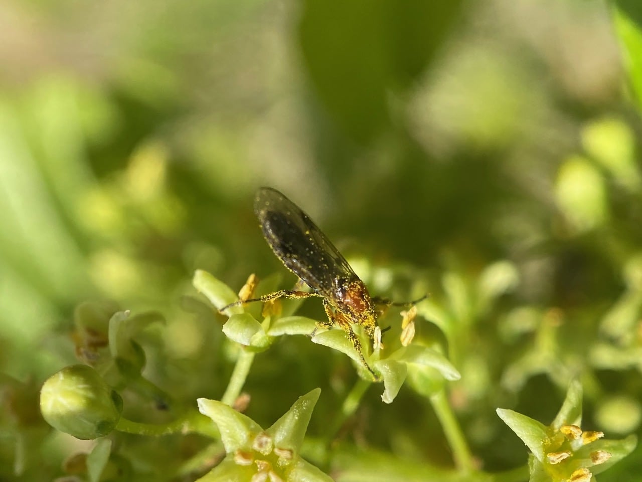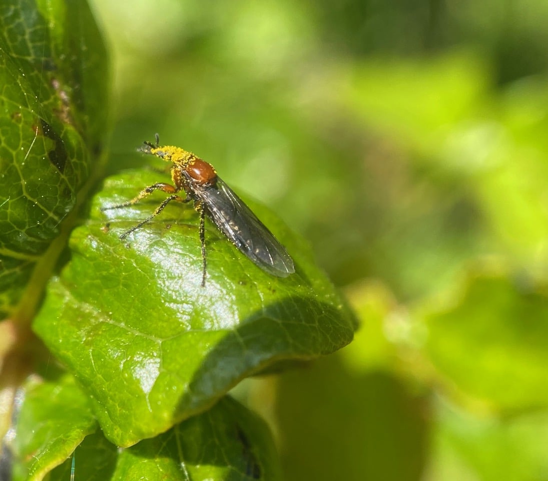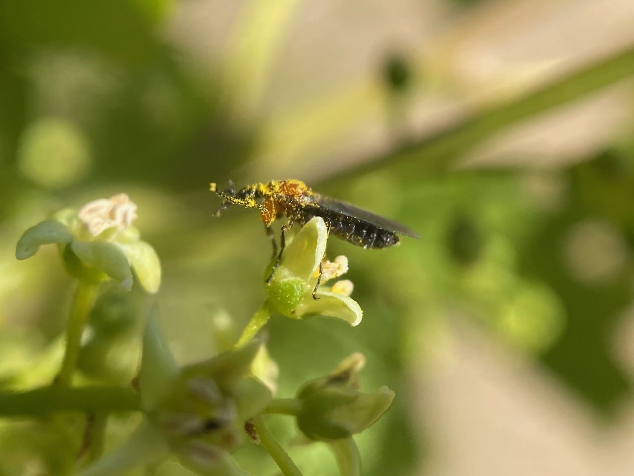 Close by, a male March Fly is also covered with pollen. These small flies are the perfect size for pollinating the Poison Oak flowers.