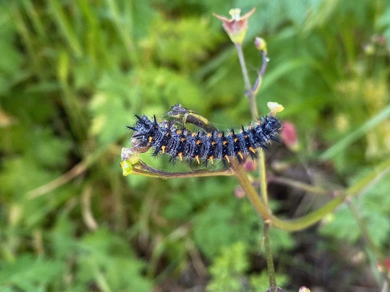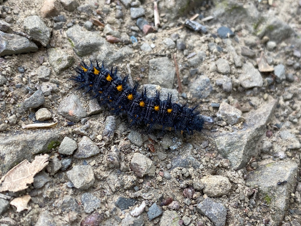 A Variable Checkerspot caterpillar is making its way across the trail. Obviously it is on its walk-about in search of a safe place to pupate.