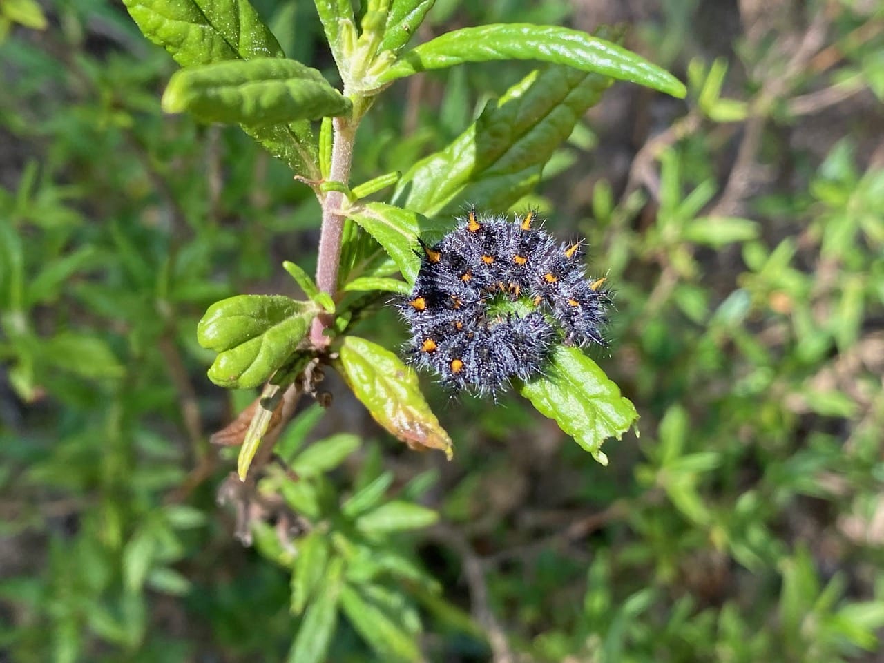 Most of the Variable Checkerspot caterpillars I find along this trail feed on the California Bee Plant. But occasionally I do see them on the Sticky Monkeyflower, Diplacus aurantiacus, just like this one. The caterpillars have a wide-ranging appetite, feeding on a variety of plants, but they seem to gravitate to these two plants. These plants provide the caterpillars with iridoid glycoside, a chemical that imparts unpalatable taste to birds, protecting the caterpillars from predators. Larvae feed in large, loose groups on the host plants. Individuals overwinter (enter diapause or hibernation) as third or fourth instar larvae in sheltered sites under bark or dead branches, in hollow stems and in rock crevices. Pupation begins in early to mid April and the adult flight season begins between mid-April and May and continues into June. The adults feed exclusively on nectar, and have a life span of about 15 days.