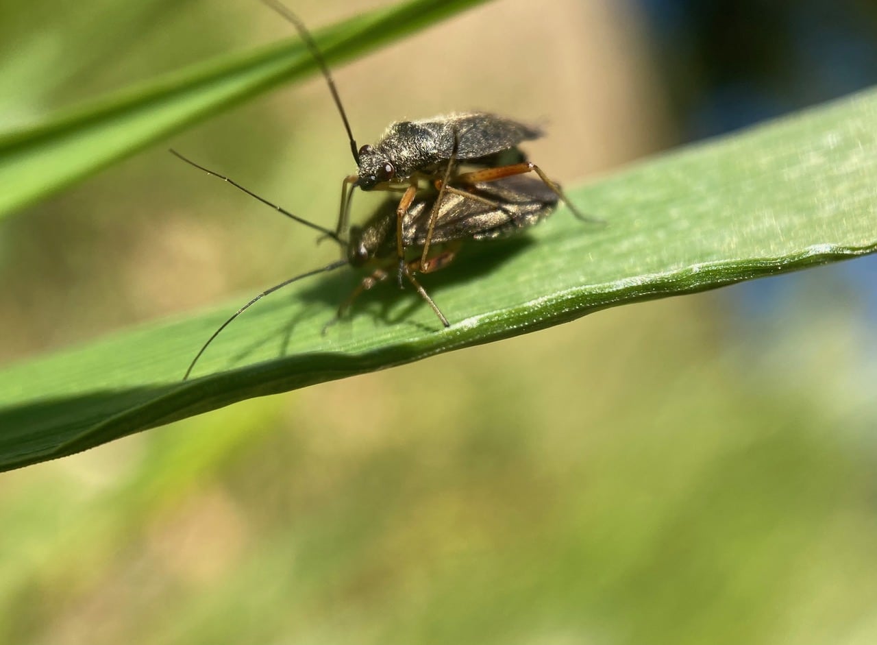 With its rostrum lowered, a Black Grass Bug, Irbisia sp. is feeding on a blade of grass.
