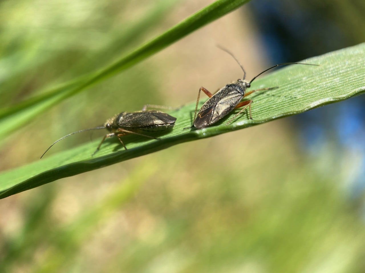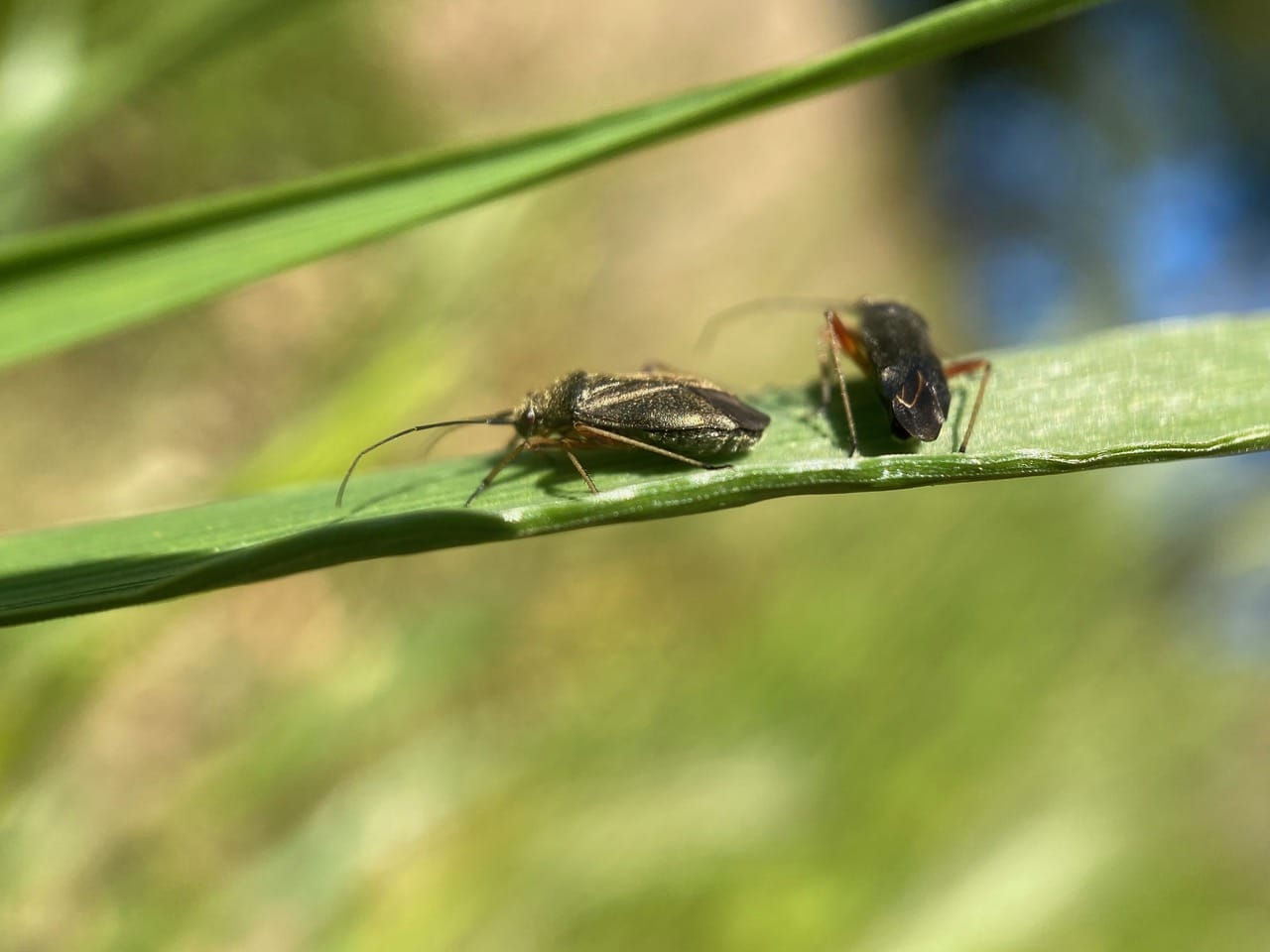 I sense that something interesting is going to happen here. The two Black Grass Bugs appear to be posturing, the one on the right getting ever closer to the other….