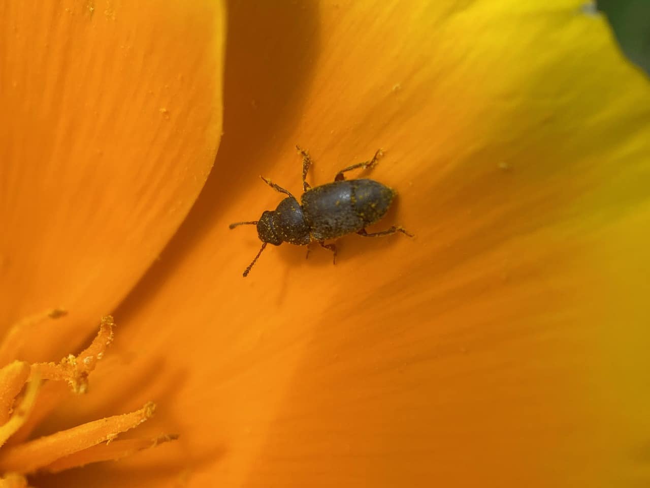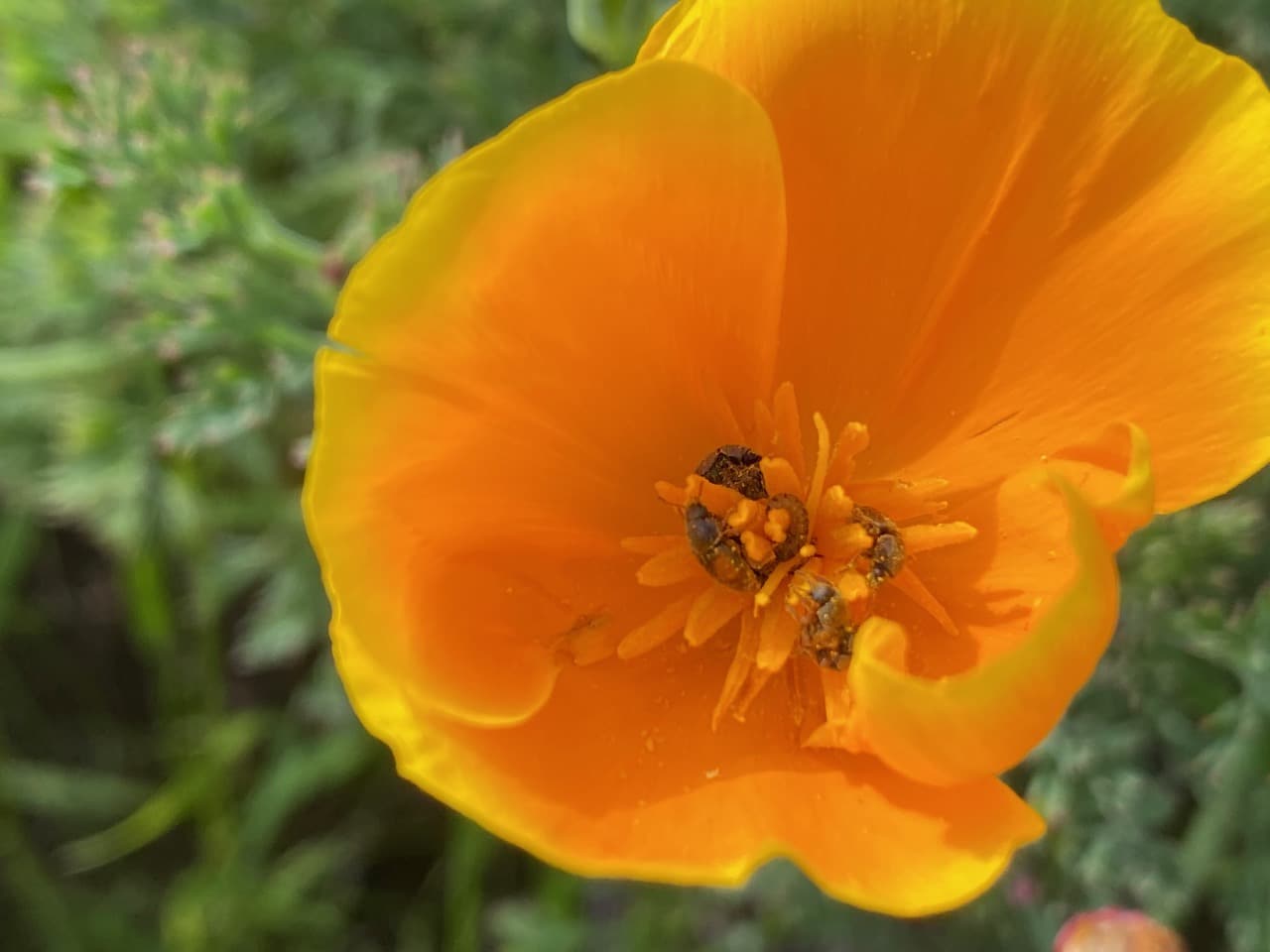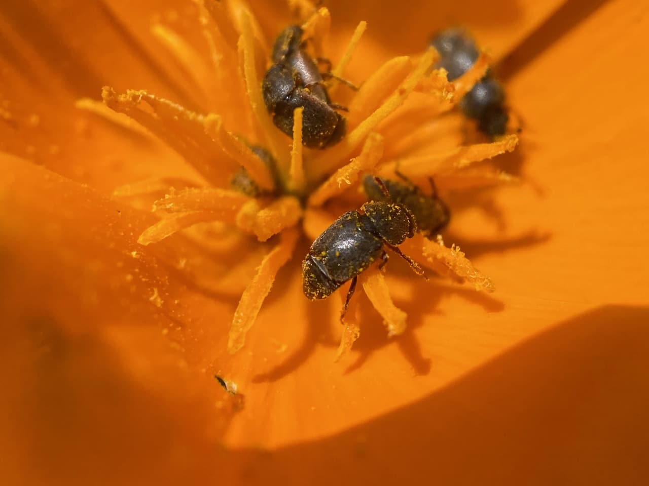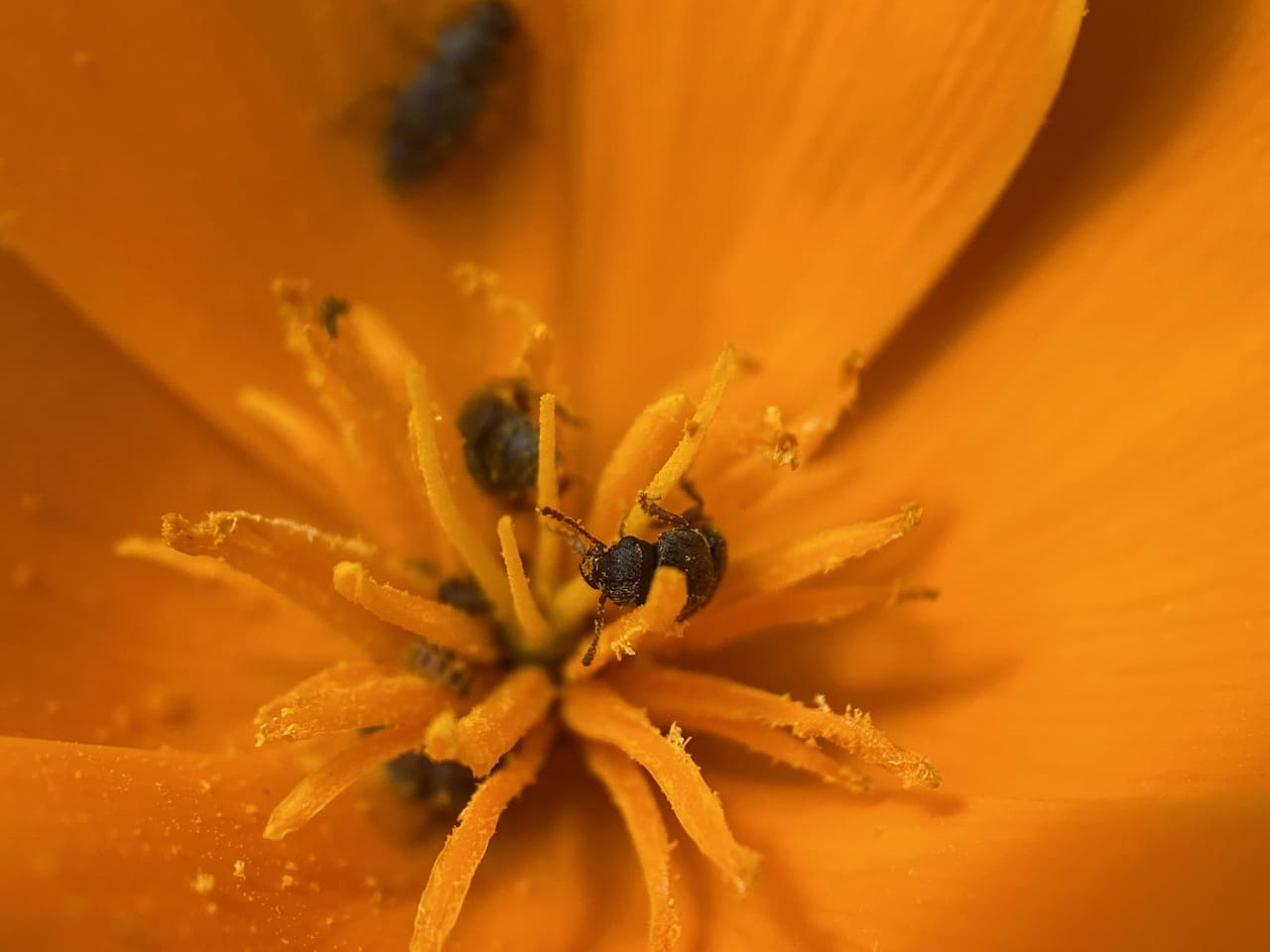 I peer into a California Poppy blooming by the trail side. Wow, it’s a cauldron of activity!