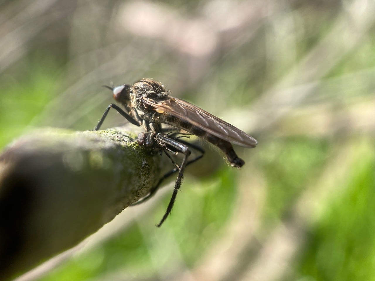 March Flies (family Bibionidae) generally live in wooded areas and are often found on flowers – adults of some species feed on nectar, pollen, and honeydew, while adults of other species don’t feed at all; and in either case, they are very short-lived. They are considered important pollinators in orchards. They are also important food for other insects and spiders. The larvae feed en masse on rotting organic materials like leaves, wood, compost, and rich soil.