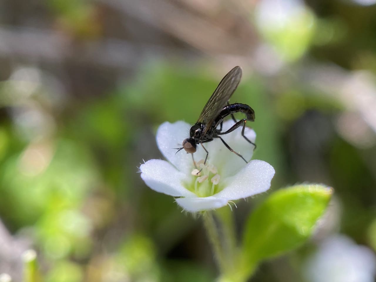 Here’s another fly feeding on a California Saxifrage flower without pollen. With long legs and straight long proboscis, the fly appears to be a member of the superfamily Empidoidea which includes Dance Flies and Long-legged Flies. Most of these insects are predatory, often with large compound eyes (sometimes covering almost the entire surface of the head), and tend to be associated with moist, temperate habitats. Some adult Dance Flies (family Empididae) also visit flowers to obtain nectar. At least a few groups obtain all their protein needs by feeding on pollen. Larvae are generally found in moist soil, rotten wood, dung, or in aquatic habitats and also appear to be predacious on various arthropods.