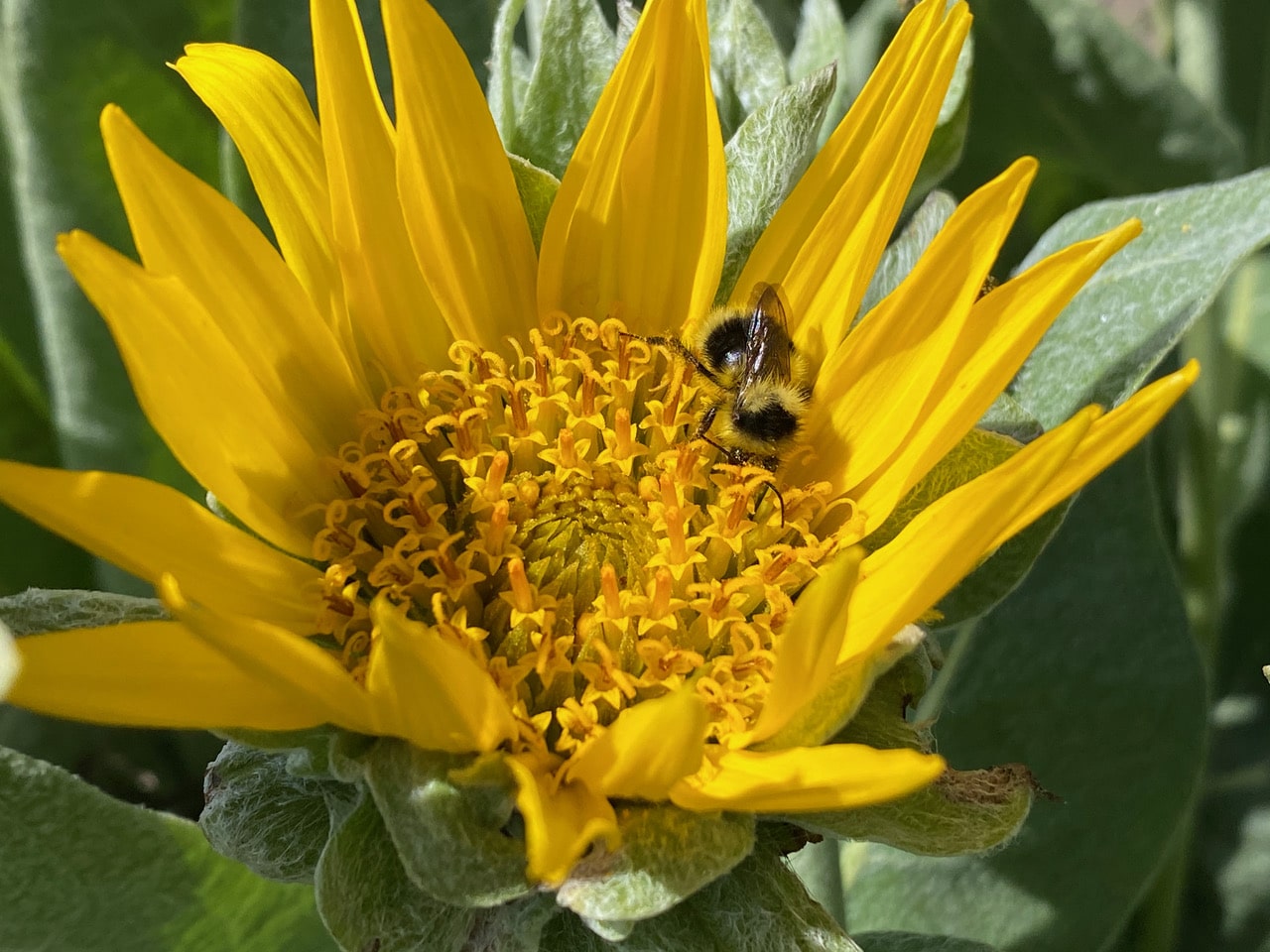 Like a lone dancer on a dance floor, a Black-tailed Bumble Bee, Bombus melanopygus is dwarfed by the huge flowerhead of the Woolly Mule’s Ears it is foraging on. There are at least 50 florets on this flowerhead. The floral resources are so rich and concentrated that the bee hardly has time to lift her head. She tends to feed along the rim of the flowerhead where the more mature flowers are located. Perhaps these give better nectar? The bee does not seem to be collecting pollen – her pollen baskets are empty.