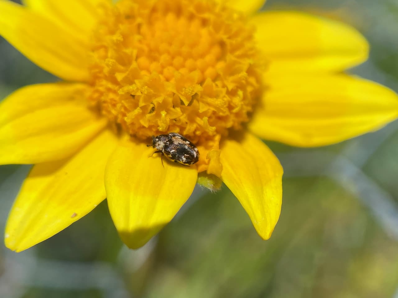 Here’s a Skin Beetle, Anthrenus lepidus (family Dermestidae) on a Goldfield flowerhead. It is probably here to feed on the abundant pollen.