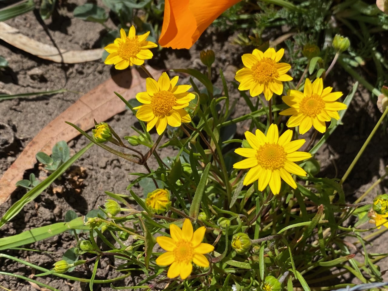 Isolated patches of Goldfields, Lasthenia sp. have shown up, brimming with cheer. Where are the pollinators?