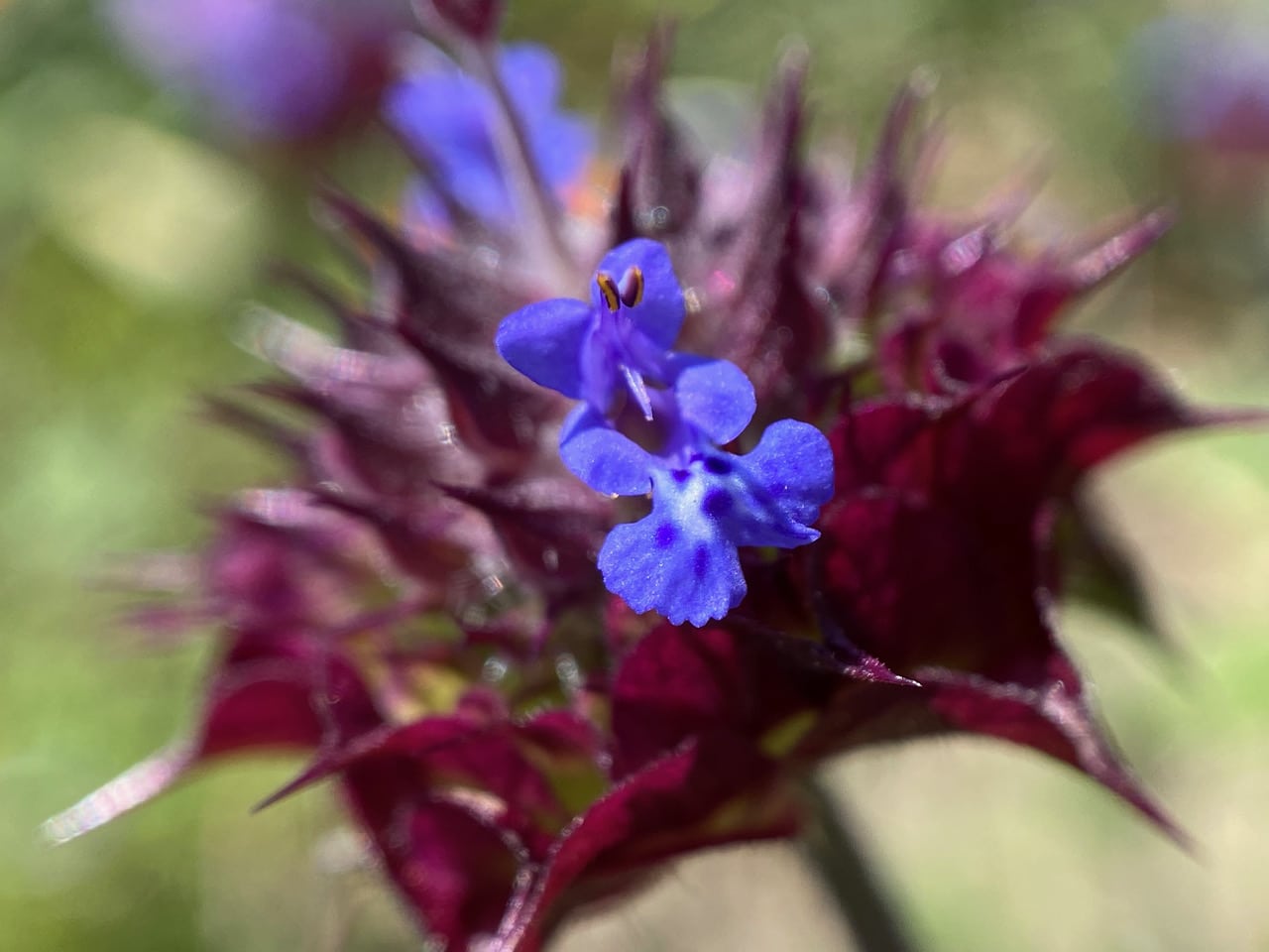Several flowers are clustered in a tight flowerhead of Chia. The deep blue corollas are subtended by spiky dark reddish-purple calyx. Close examination of the flower shows the typical floral structure of Salvia: bilateral symmetry with 2-lipped corolla. The lower lip has two lobes. The stamens are reduced to two short structures with anthers two-celled, the upper cell fertile, and the lower sterile. The flower styles are two-cleft. The fruit of Chia is a nutlet, once an important food for Native Americans.