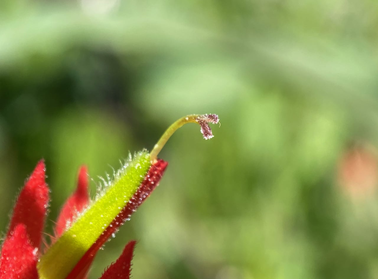 Here’s an older flower that has been pollinated, its bi-lobed stigma covered with pollen. A hummingbird must have visited the flower to sip nectar, and in the process depositing some pollen that has hitchhiked on its body from a previous flower it visited.