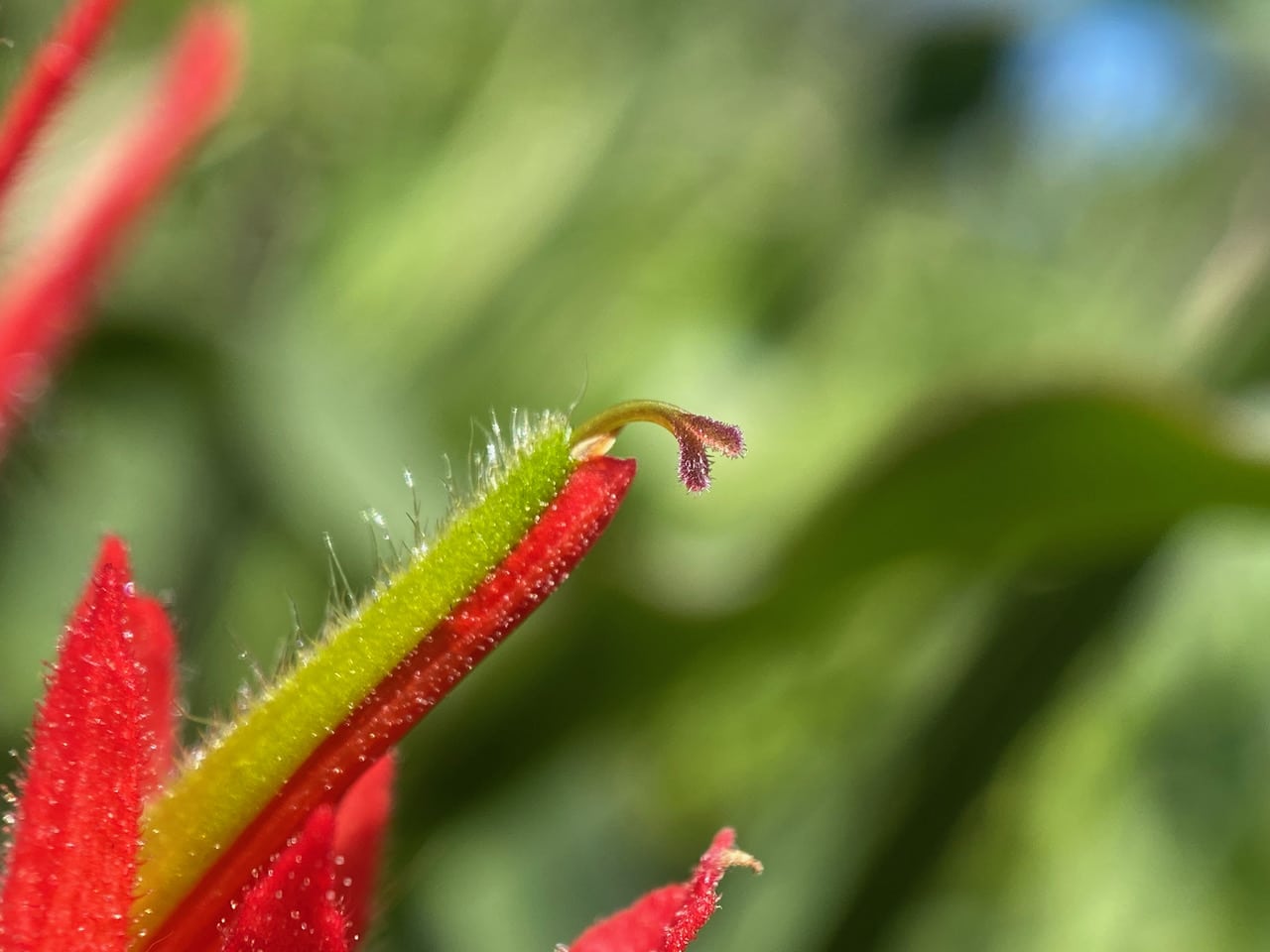 The showy red structures of Indian Paintbrush are technically not petals, but bracts, a type of modified leaf. The tip of the sepals are tinged with red as well. The petals are usually green or yellow, and curiously arranged, with the upper two extending out into a long, pointed beak that envelops the stamens and style. With tubular design and red color, the flower is especially adapted for pollination by hummingbirds. The hummers have long slender bills that allow them to reach the nectar rewards at the base of the flowers.