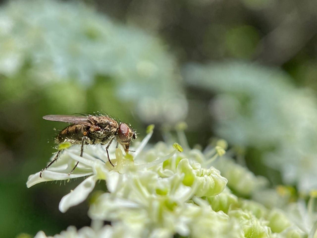 A Blacklet is feeding on the flowers of Cow Parsnip, the underside of its body smeared with the sticky white pollen.