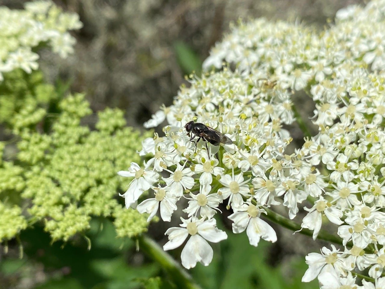 The glossy, black hoverflies, the Blacklets, Cheilosia sp. (family Syrphidae) are the most commonly seen visitors to the large umbels of the Cow Parsnip flowers today.