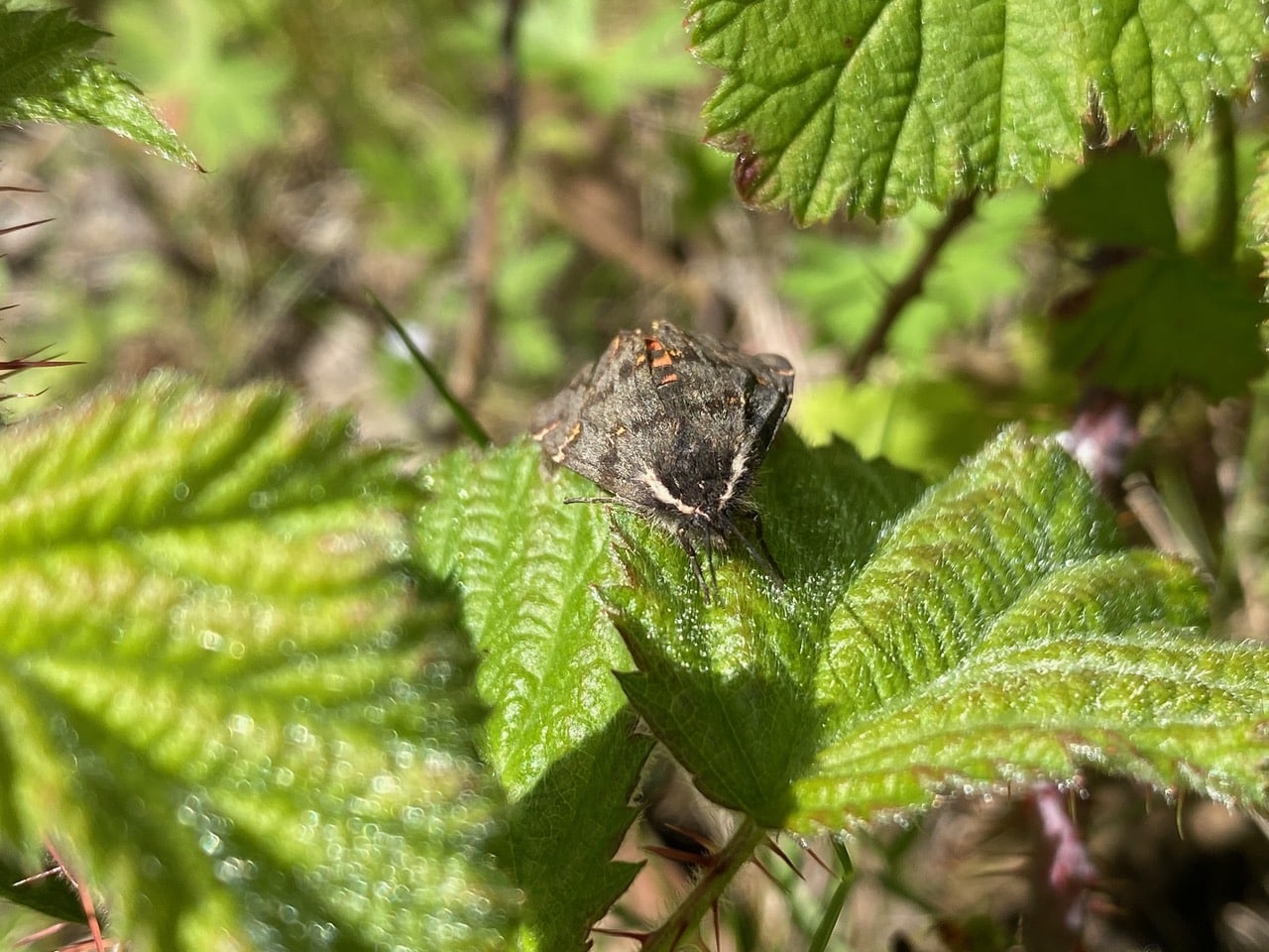 Close to the ground, a moth is resting motionless on a leaf of California Blackberry, Rubus ursinus. It has been identified by iNaturalist as a California Tiger Moth, Leptarctia Californiae (subfamily Arctiinae, family Erebidae).