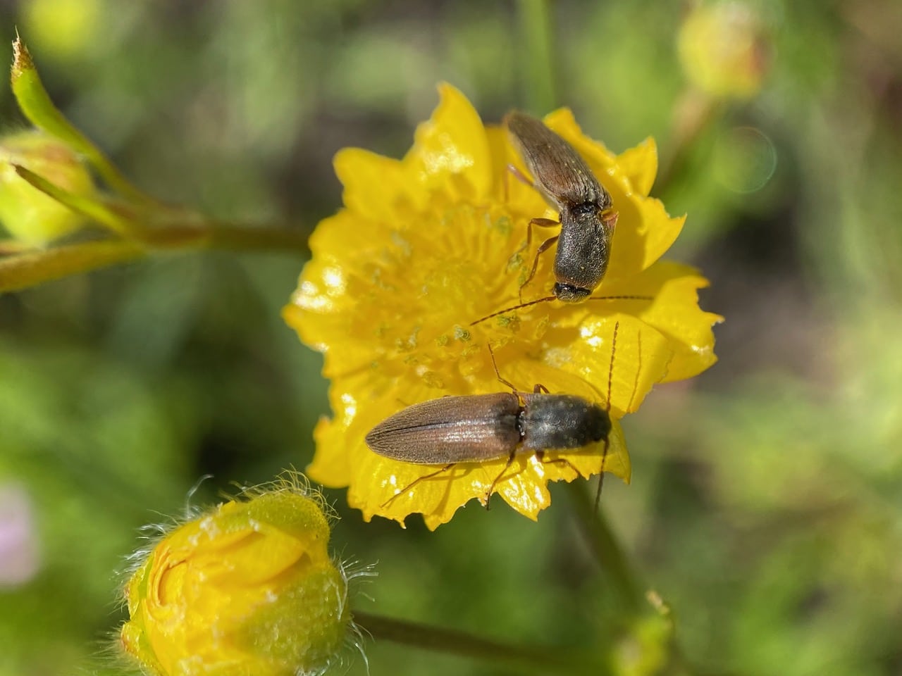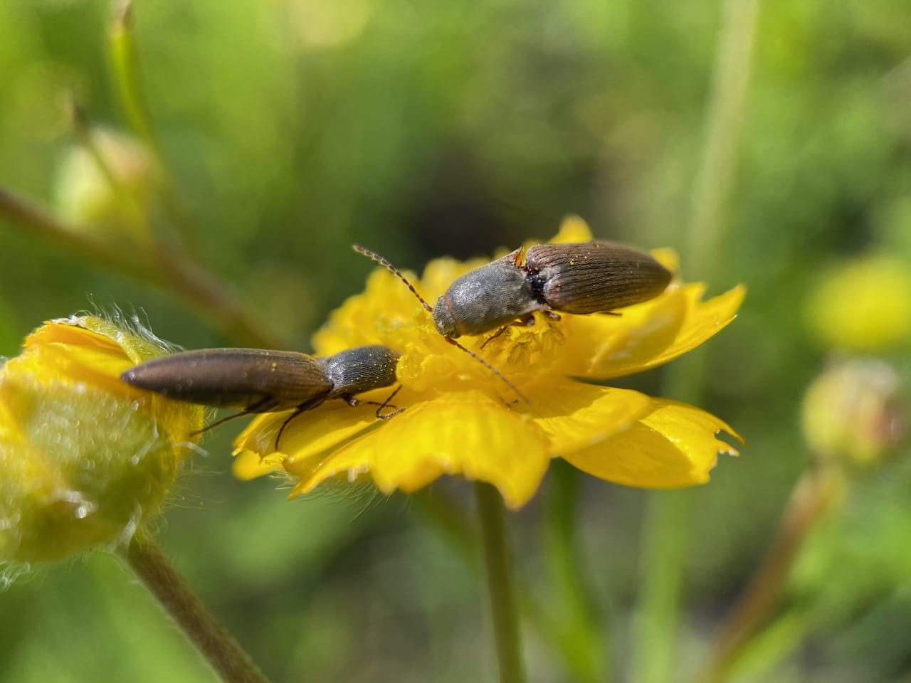 Two Click Beetles meet on a decimated buttercup flower. Are they responsible for chewing the petals into these jagged nubs?