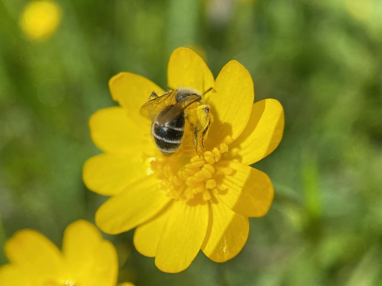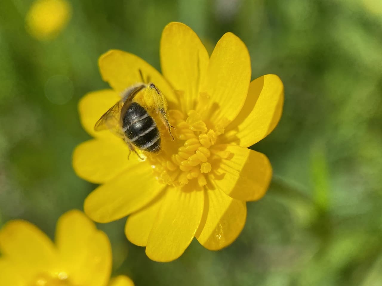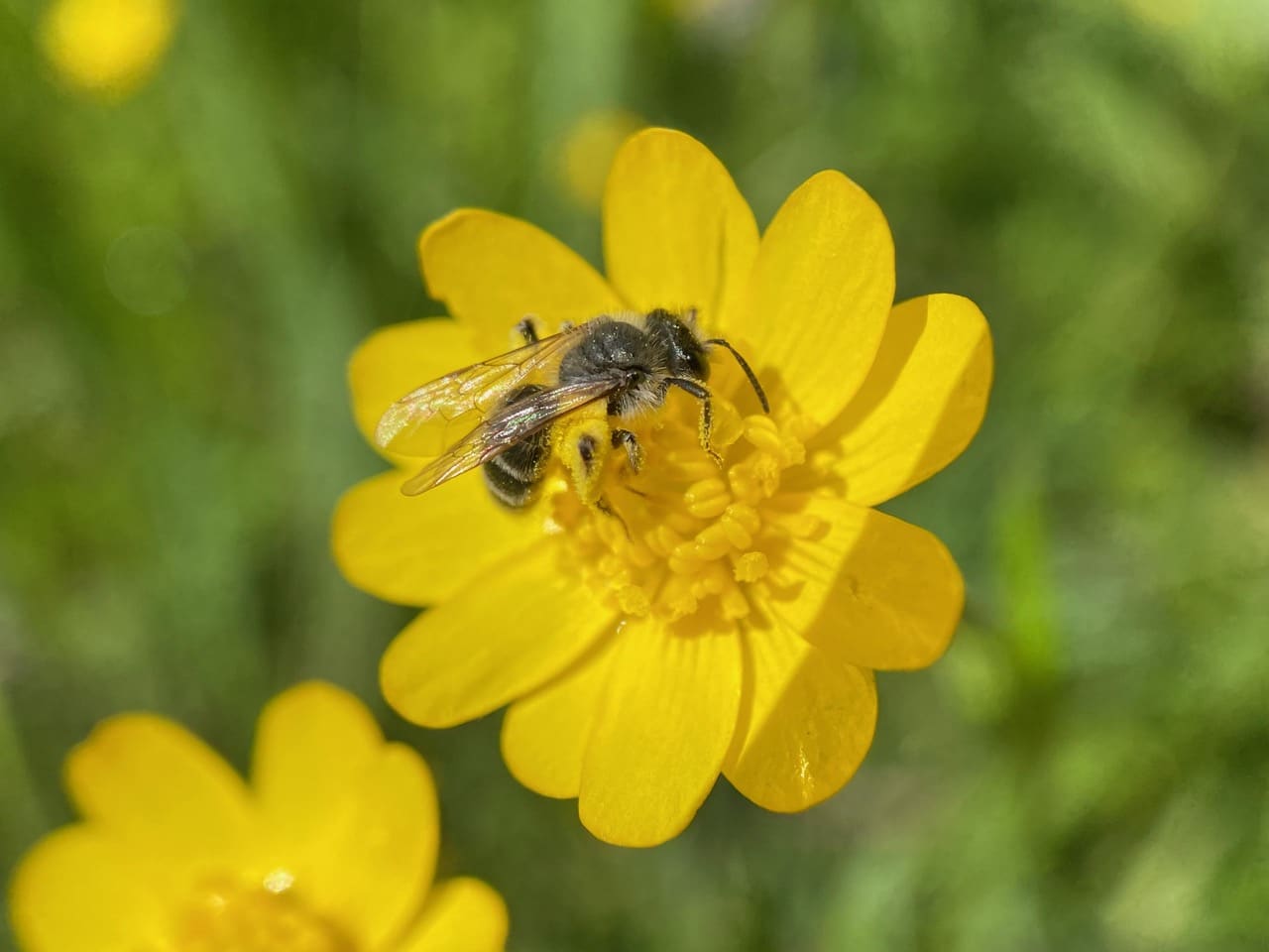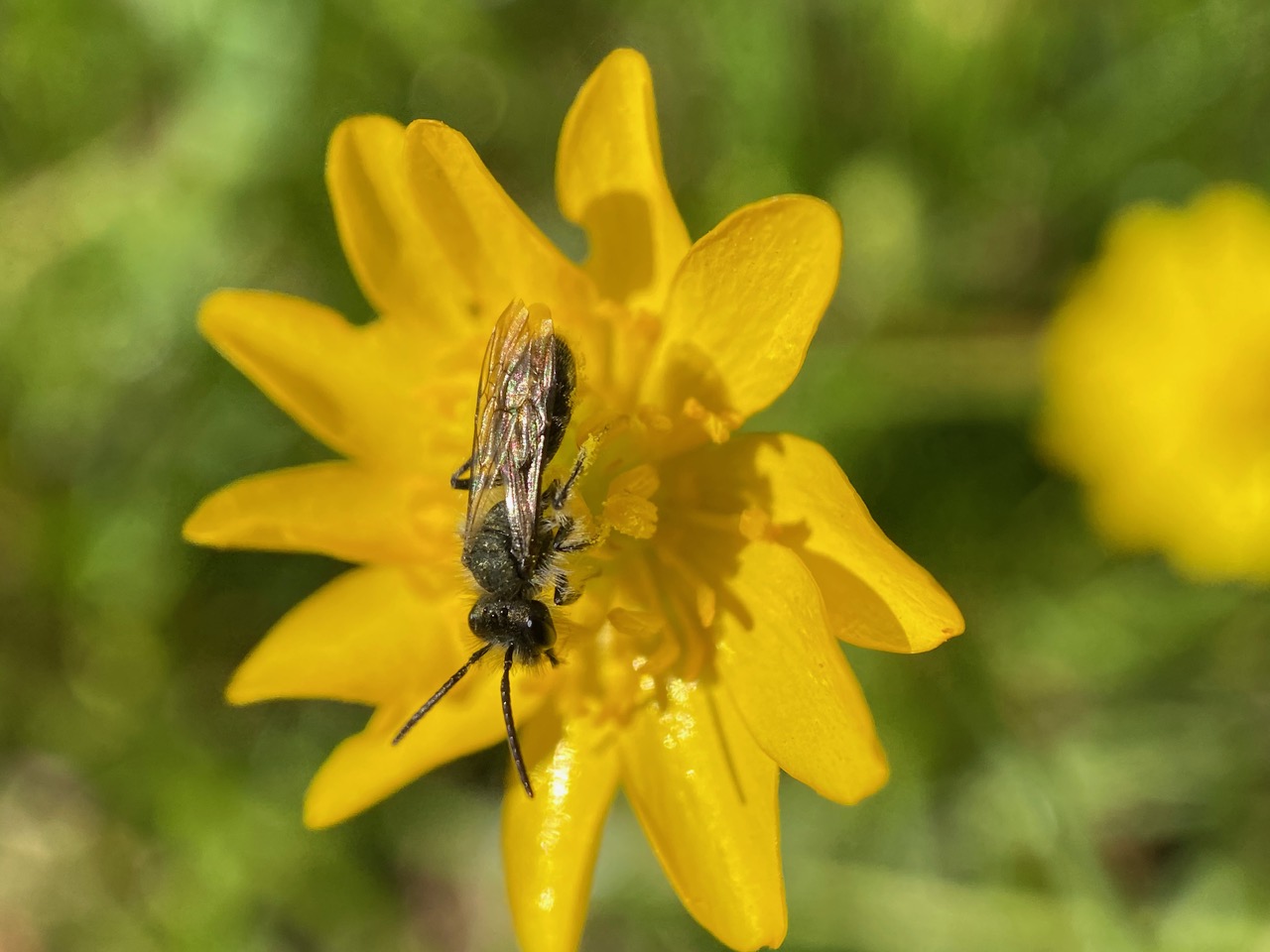 As I have expected, there are a few male Mining Bees, Andrena sp. (family Andrenidae) still asleep on the buttercup flowers. Most of them are found in a small patch in the back of the park, at the edge of the forest.