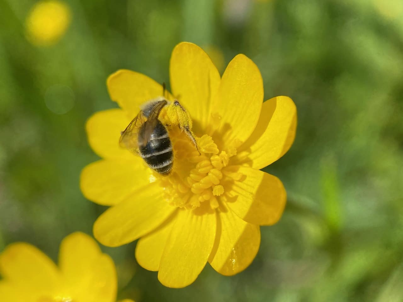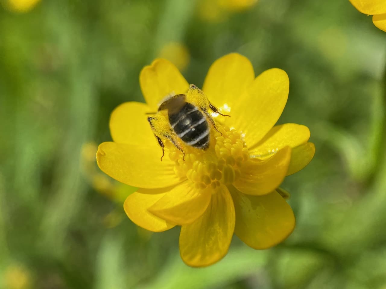 I have barely entered Skyline Gardens through the cattle gate when I spot female Andrena bees foraging on the flowers of California Buttercup, Ranunculus californicus. It is delightful to see so many in this small patch of buttercup.