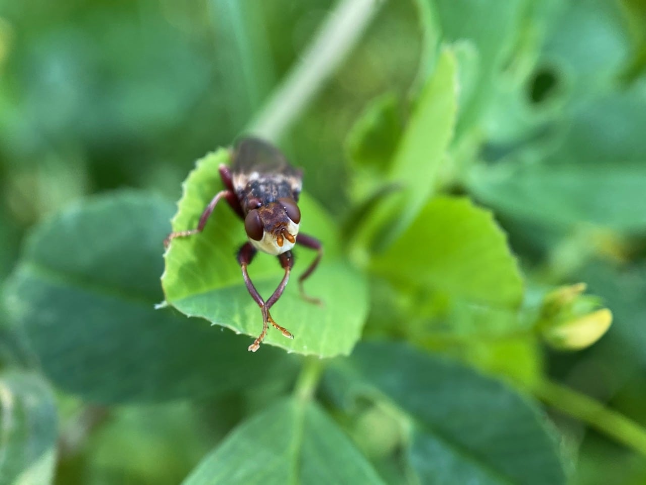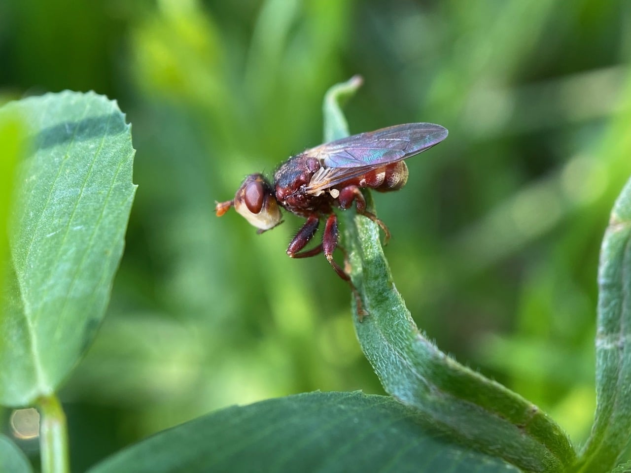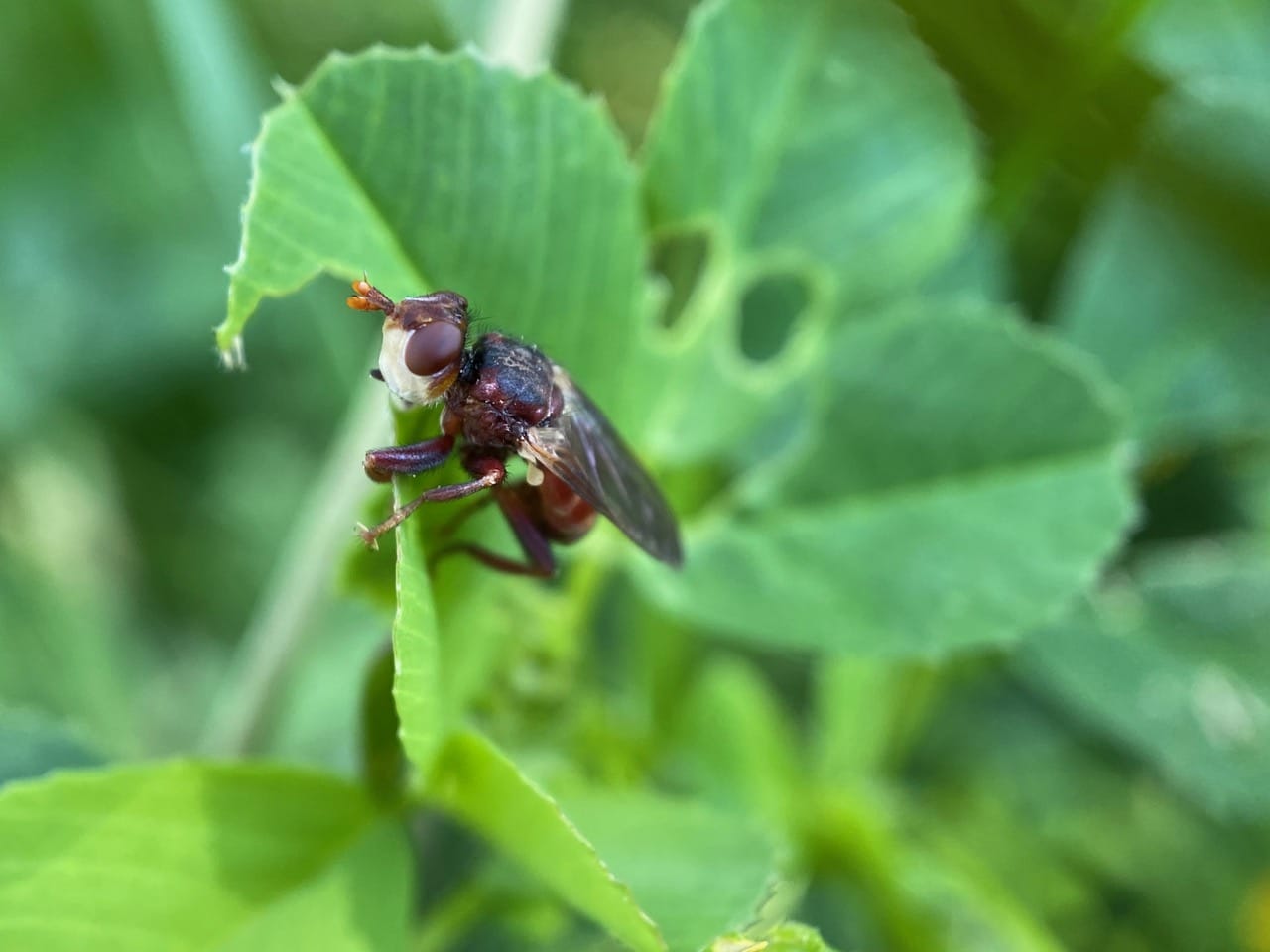 A brownish fly perched on a clover leaf among the buttercups catches my eye. I don’t often see flies this color. Surprisingly, the fly does not budge as I approach for a closer look. Is it sleeping?