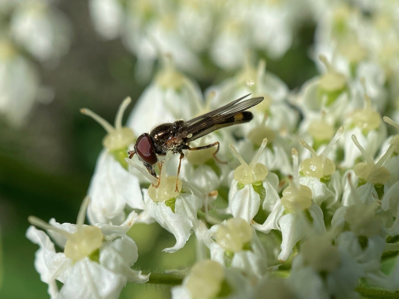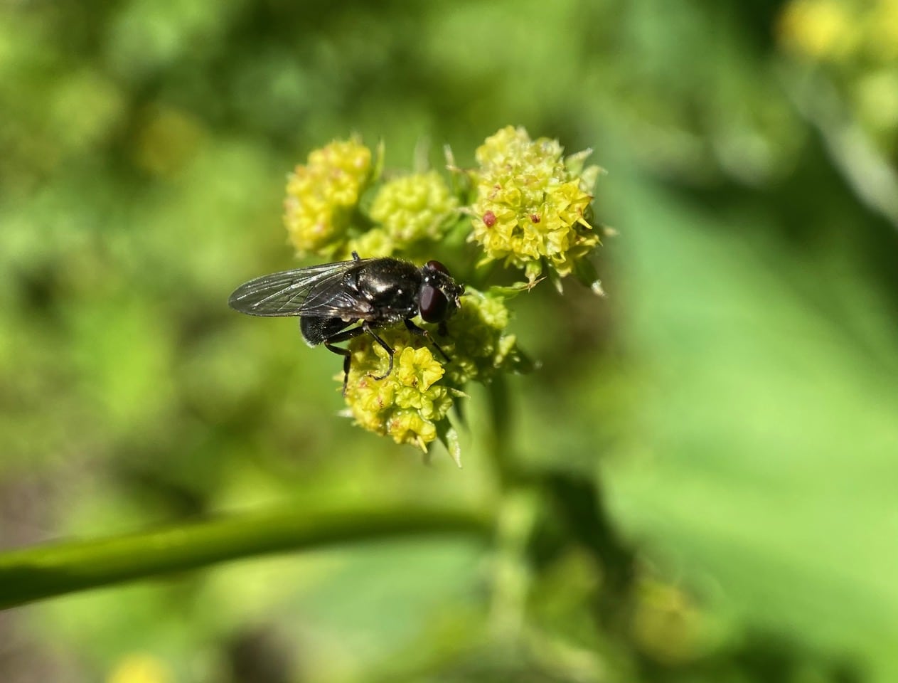 A Blacklet hoverfly, Cheilosia sp. (family Syrphidae) is foraging on a Pacific Sanicle.