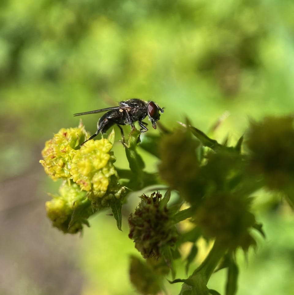 A Sedgesitter, Platycheirus sp. (family Syrphidae) forages on a flower cluster of Pacific Sanicle, Sanicula crassicaulis.