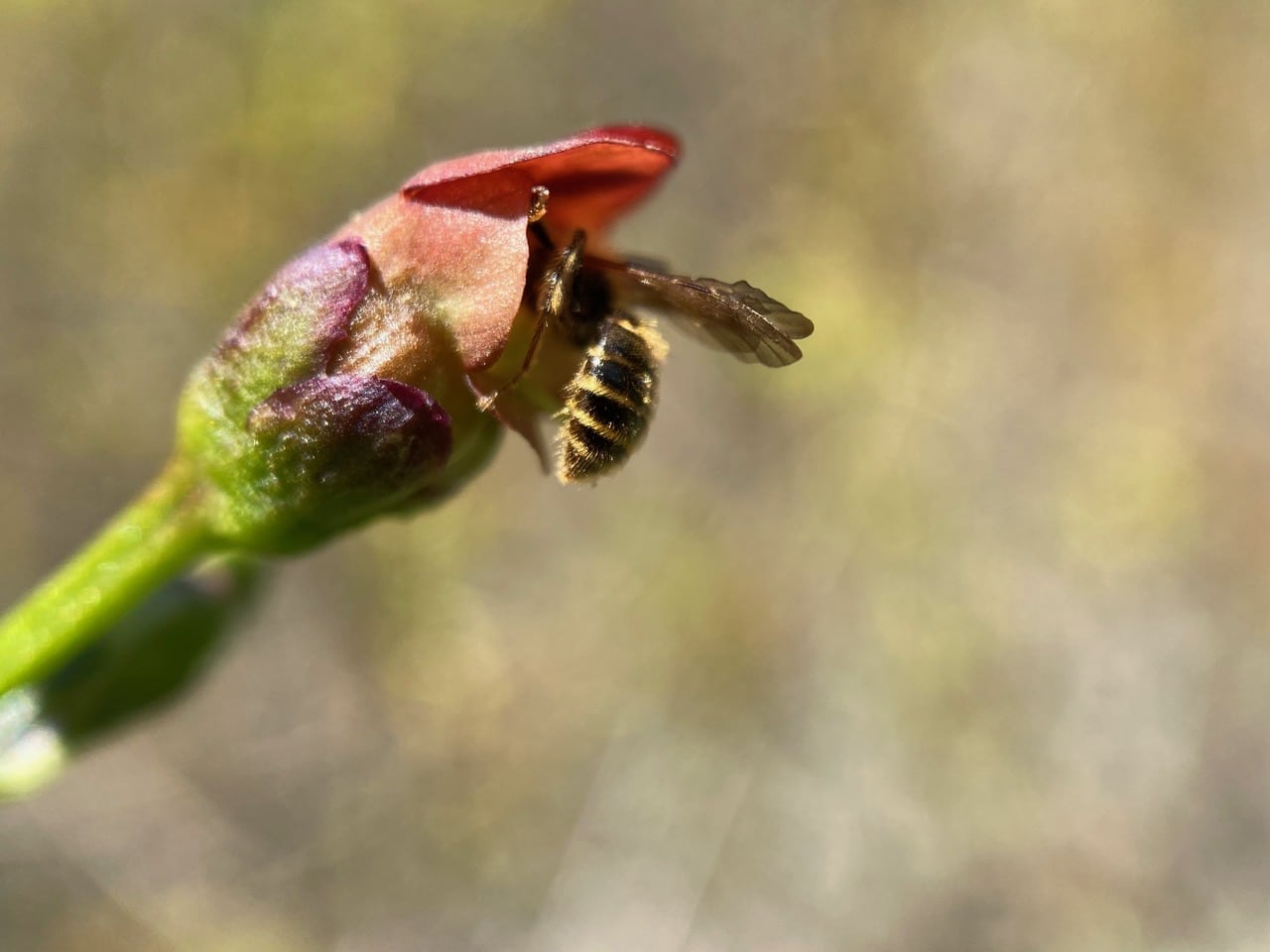 A female bee (with short antennae) is perched on the rim of a Bee Plant flower for a long time. Even though the light is poor in this direction, I can see that she is using her mandibles on an immature anther. The flower is in its female phase with the relatively fresh style directing forward towards the bee’s belly. The Bee Plant is protogynous, the female parts maturing before the male parts. The stigma is receptive to incoming pollen in the female phase, before the anthers of the same flower release their pollen. The bee has to use her mandibles to extract pollen from the anthers. You would not see a male bee do this, as they do not collect pollen to provision the nest.