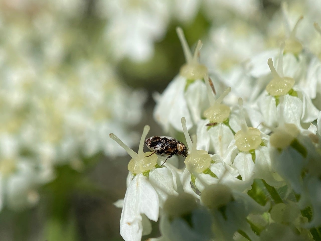 A Skin Beetle, Anthrenus lepidus (family Dermestidae) is feeding on a style base of a Cow Parsnip flower.