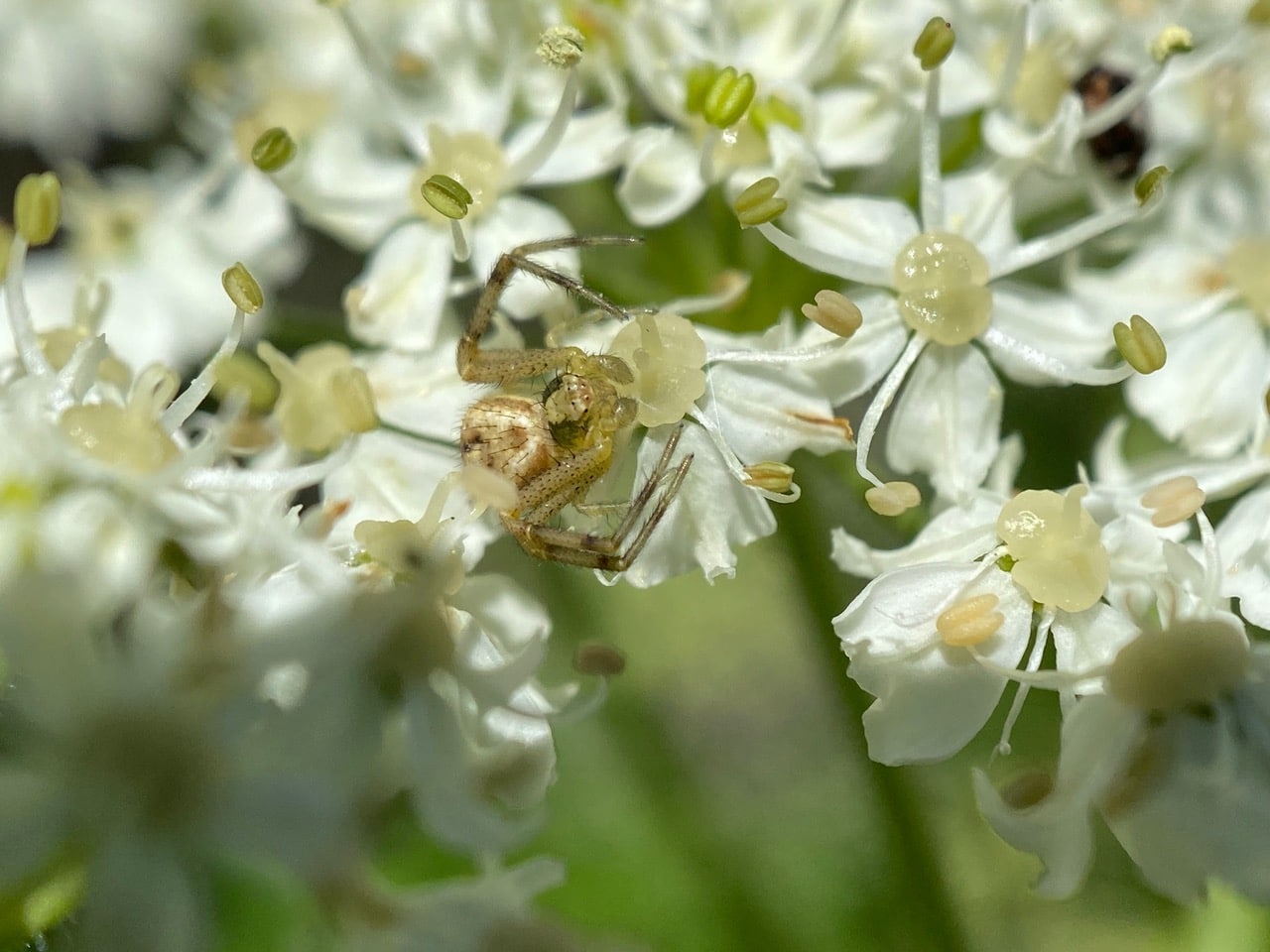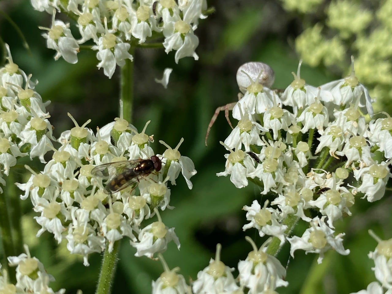 And here’s a different species of Crab Spider, Mecaphesa sp. (family Thomisidae) trying its best to look like a flower. Cow Parsnip flowers are spider city! Nectar and pollen are abundant here, but they come with risks!