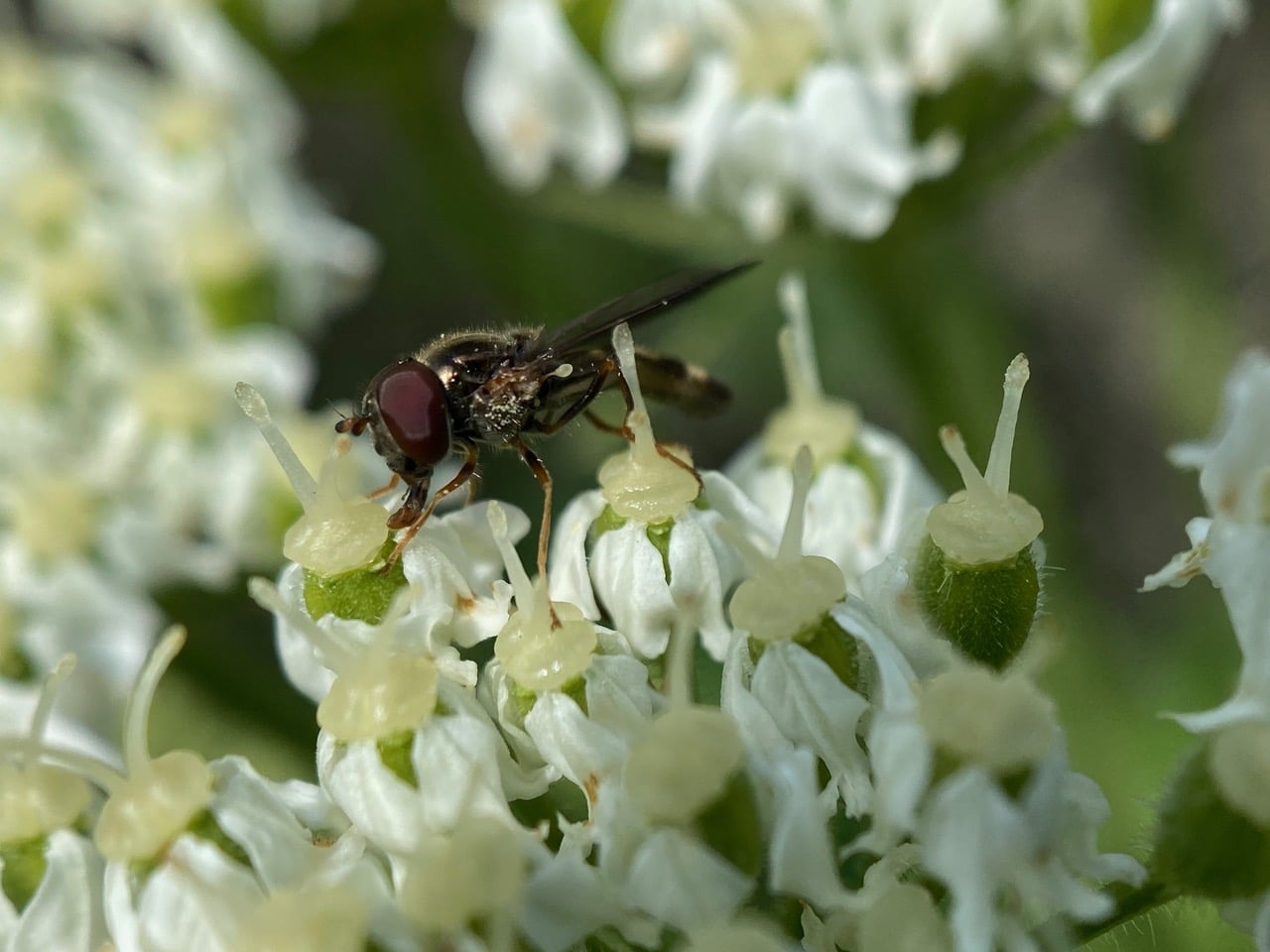 A Sedgesitter, Platycheirus sp. (family Syrphidae) is feeding from the style base of a Cow Parsnip flower. Note that despite appearances, the succulent, swollen white structure is not the ovary. Members of the carrot family, Apiaceae have inferior ovaries, located beneath the petals. You can see glimpses of the green ovaries between the petals. I notice that most insect visitors to Cow Parsnip flowers have their mouthparts aimed at the swollen style bases, probably where the nectar is produced.