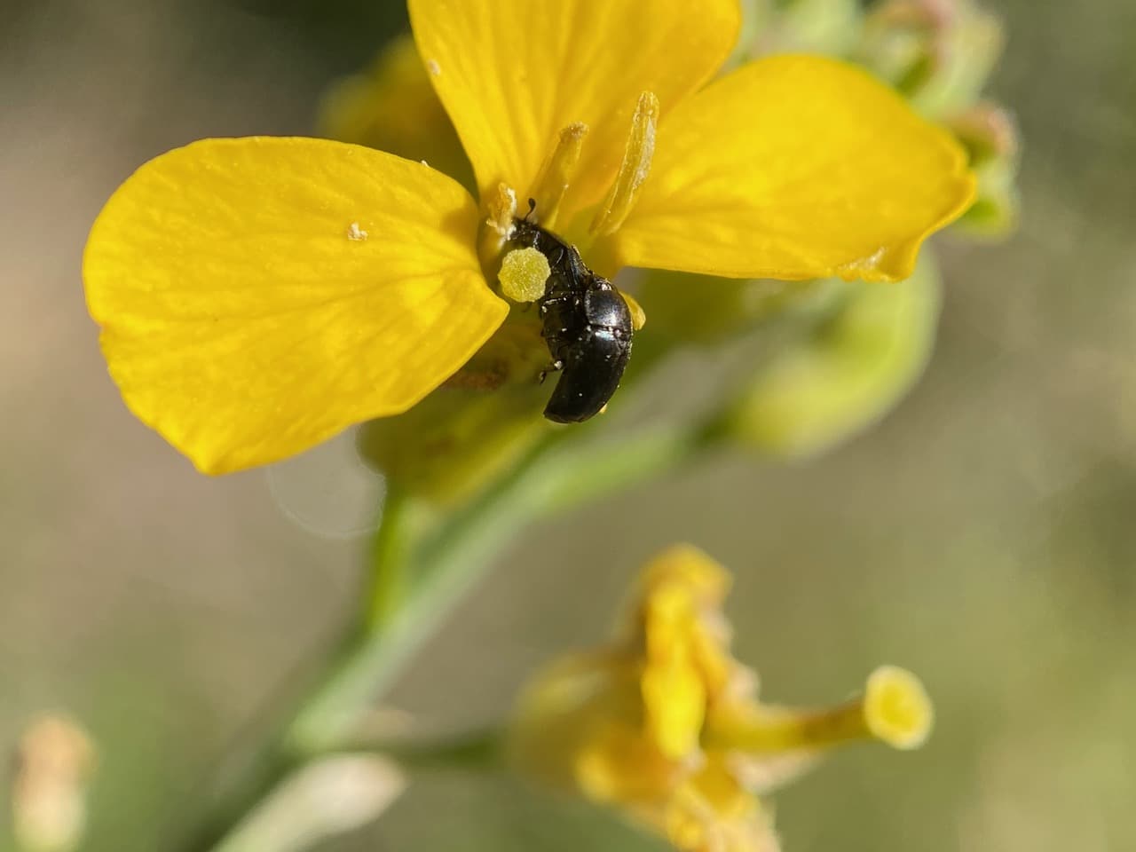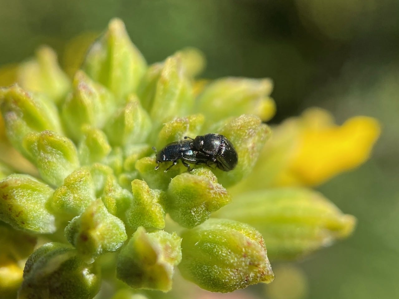 The Common Pollen Beetle, Brassicogethes aeneus (family Nitidulidae) is found in Europe, Northern Asia and North America. Adults are 2-3 mm long, black with a hint of metallic green, and have knobbed antennae. It is a known pest of oilseed rape. It is unclear whether the beetles contribute to the pollination of the crop. The female beetle lays its eggs in the flower buds of the host-plant and the larvae develop within the flowers. Both adults and larvae feed on the pollen and nectar in the flowers.
