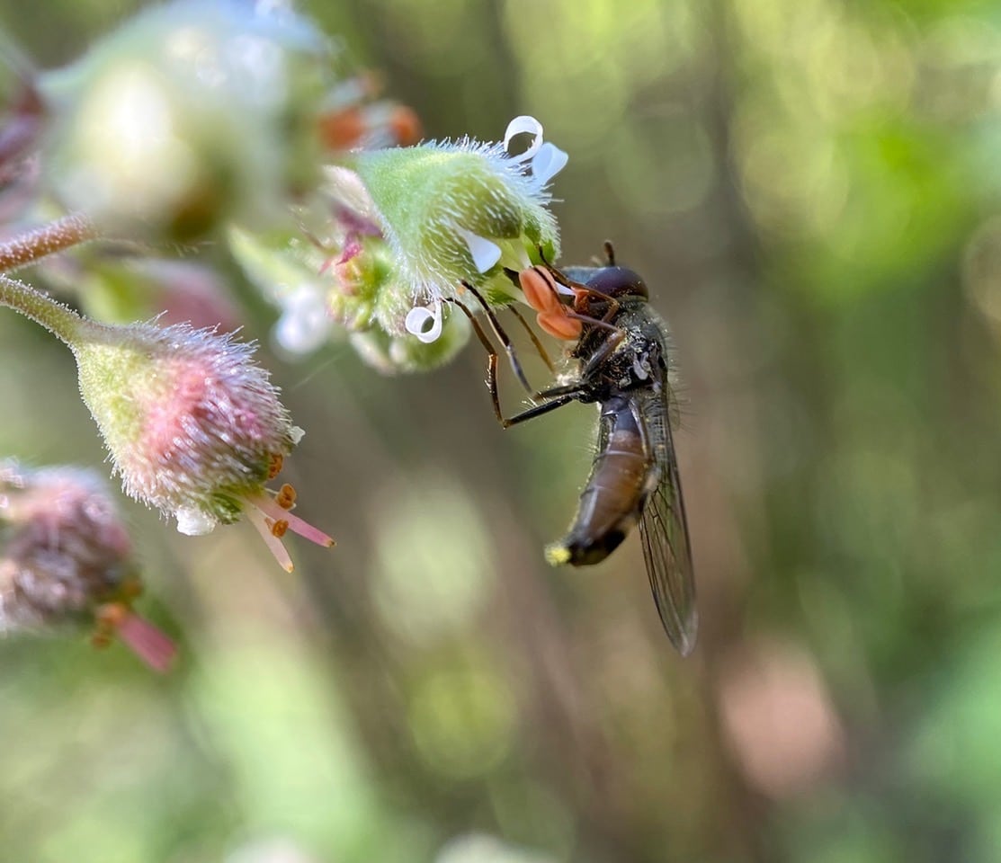 As the bee pulls out of the flower, the hairs of its legs have picked up some of the orange pollen. Unfortunately I don’t get a look of its face before it flies off, so am not able to tell what bee it is. This reminds me that some of our native solitary bees are tiny. They look like gnats/midges when they fly around flowers.