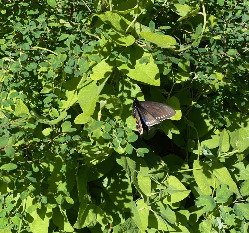 As I entered the garden, I encountered several Pipevine SwalIowtail butterflies flitting around. It’s a good sign that they might have started to reproduce. I check the low-growing young pipelines for their eggs. These are easy to spot, as they are orange.