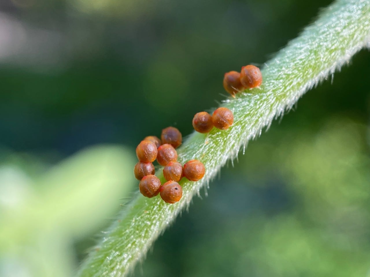 The eggs are usually laid on the stems, or the underside of tender leaves.