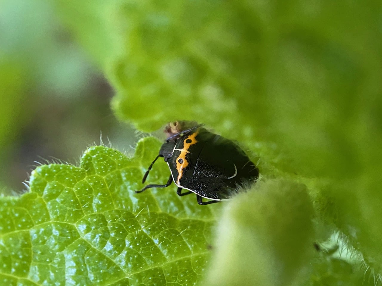 A Hedge-nettle Stink Bug, Cosmopepla conspicillaris (family Pentatomidae) is resting on a terminal leaf of Wood Mint (also known as Hedge Nettle), Stachys sp. (Lamiaceae).