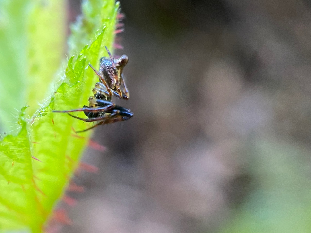What is this male Conical Trashline Orbweaver doing on a Wood Mint leaf? Note that his abdomen is much slimmer than the female’s. Like the female, his cephalothorax is also black. The male is standing stock-still, holding his two front pairs of legs up in a cocked position. Is he displaying to a female, or threatening a rival male? It must take a lot of energy to be holding this pose for so long. There are no other spiders on the leaf. There’s so much we don’t understand about these arachnid behaviors.