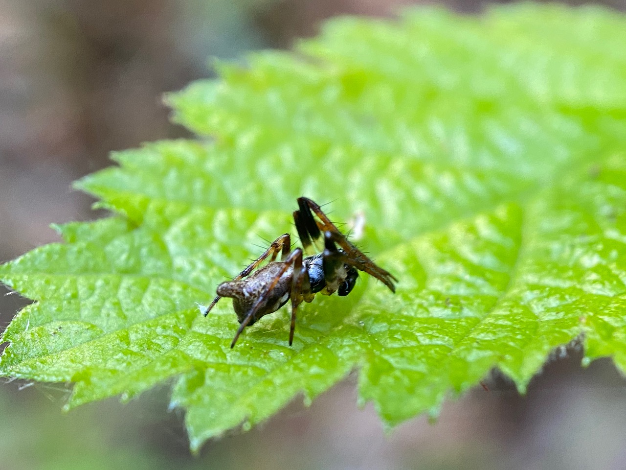 What a strange sight! A male Common Candy-striped Spider, Enoplognatha ovata (family Theridiidae) is resting stock-still in a spread eagle position on a Wood Mint leaf, his swollen pedipalps hanging under his face. Is he displaying to a female?