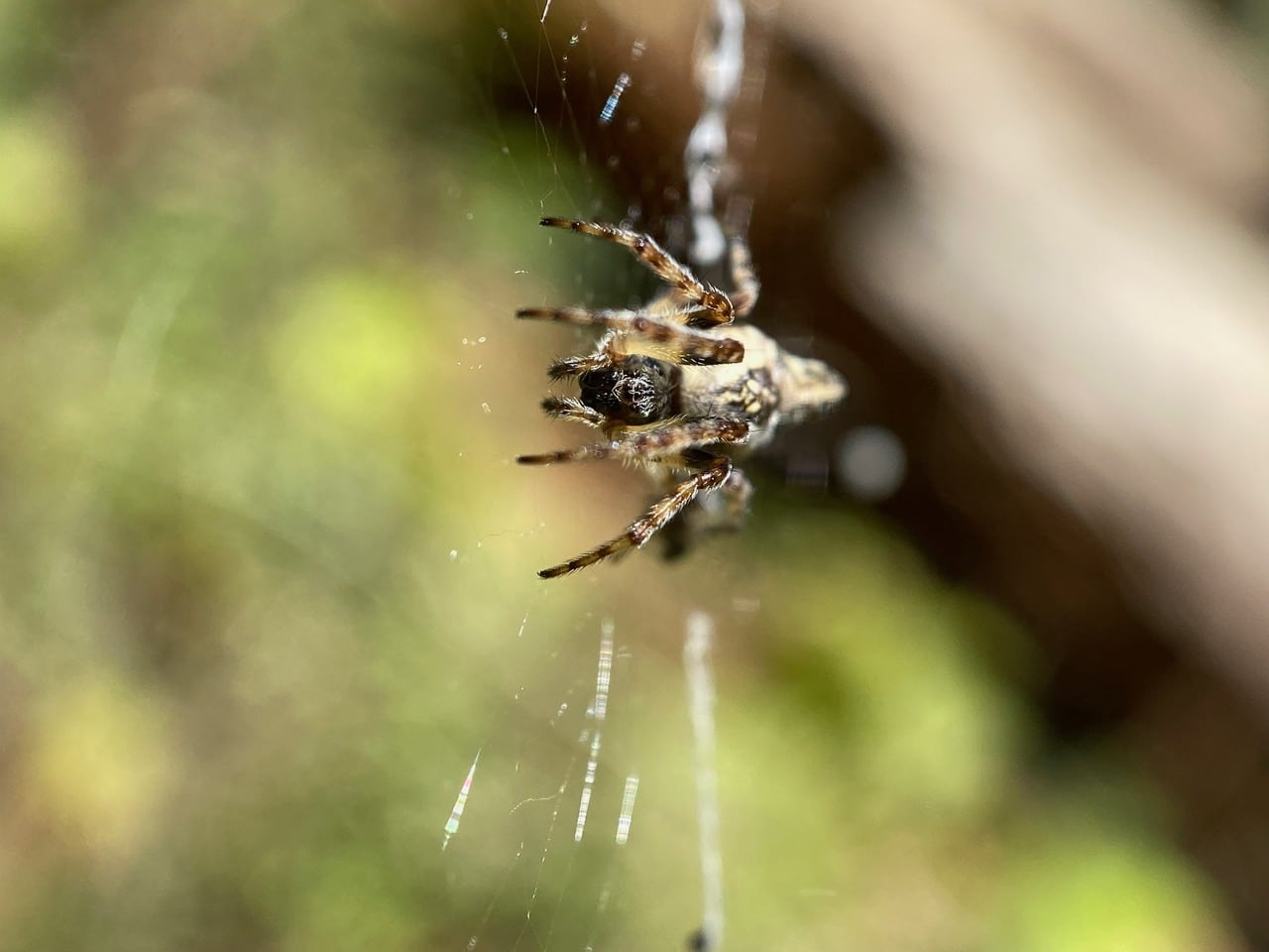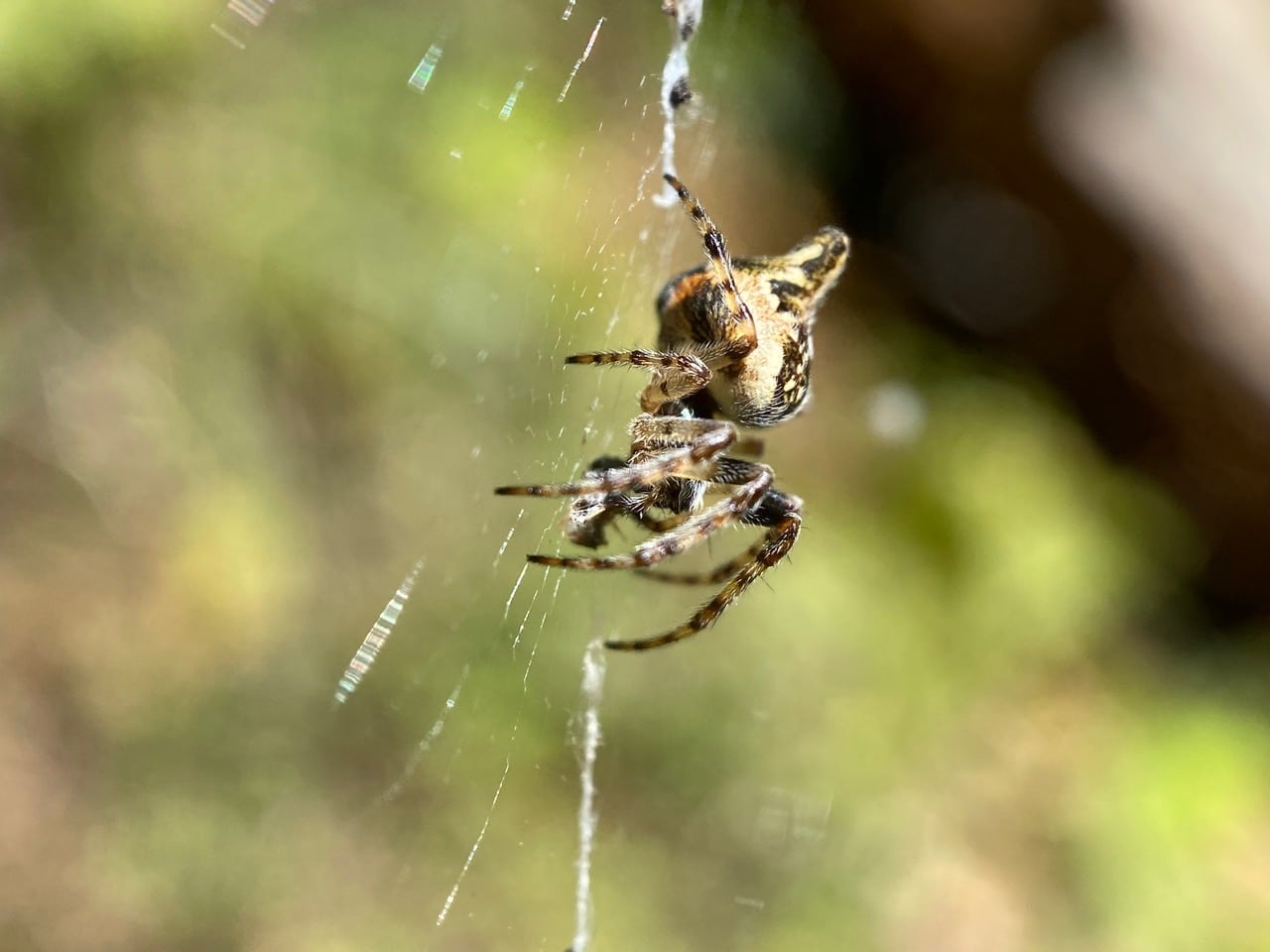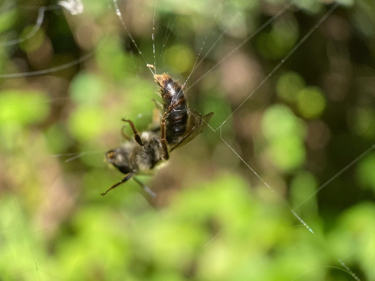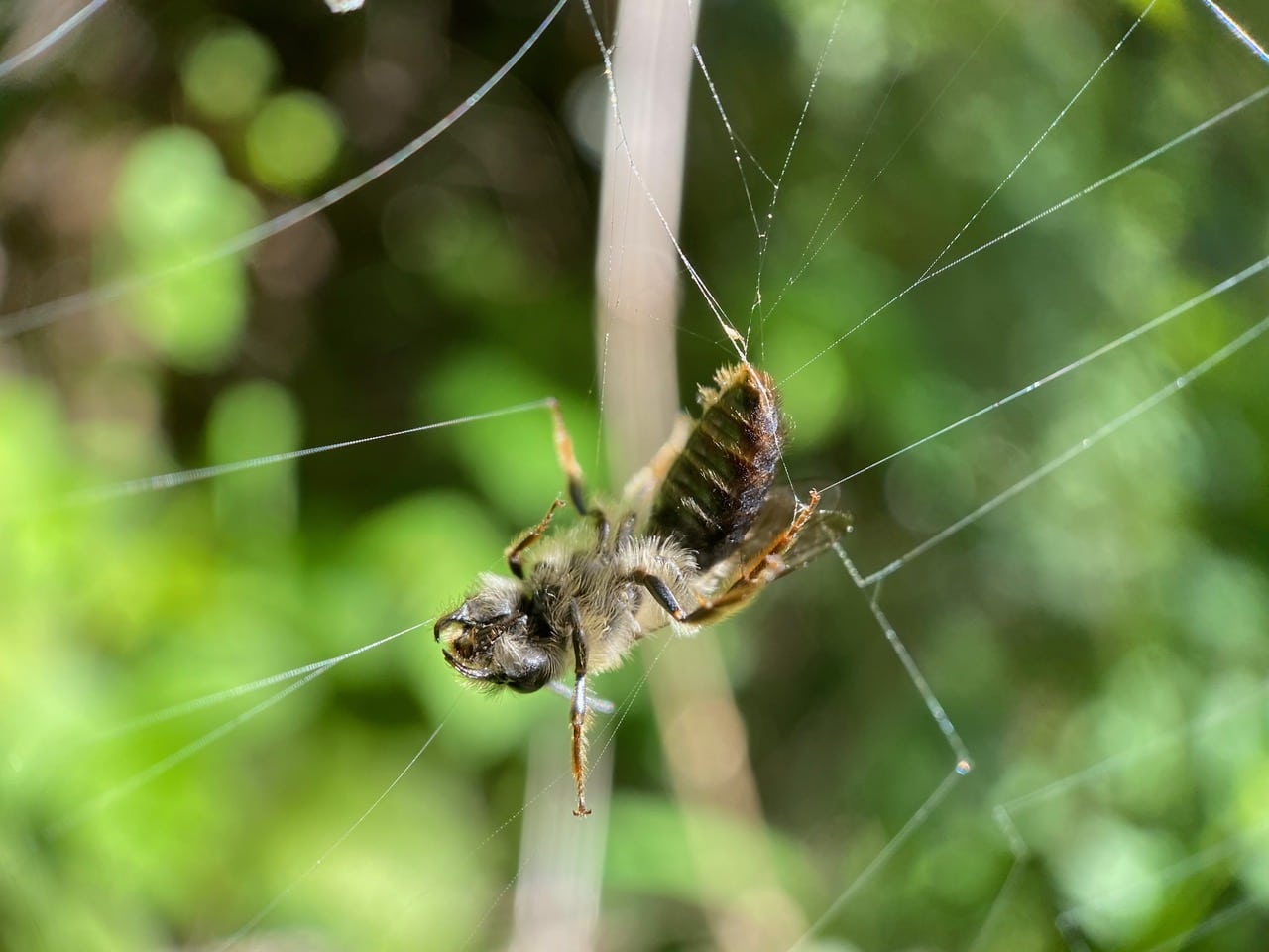 Without much thought, and keeping an eye out for any approaching spider, I reach into the web with my finger and scoop out the little bee. It clambers onto my finger for a second, and flies off, none the worse for wear. No spider appears – good, I hate to think that I have deprived it of a meal.