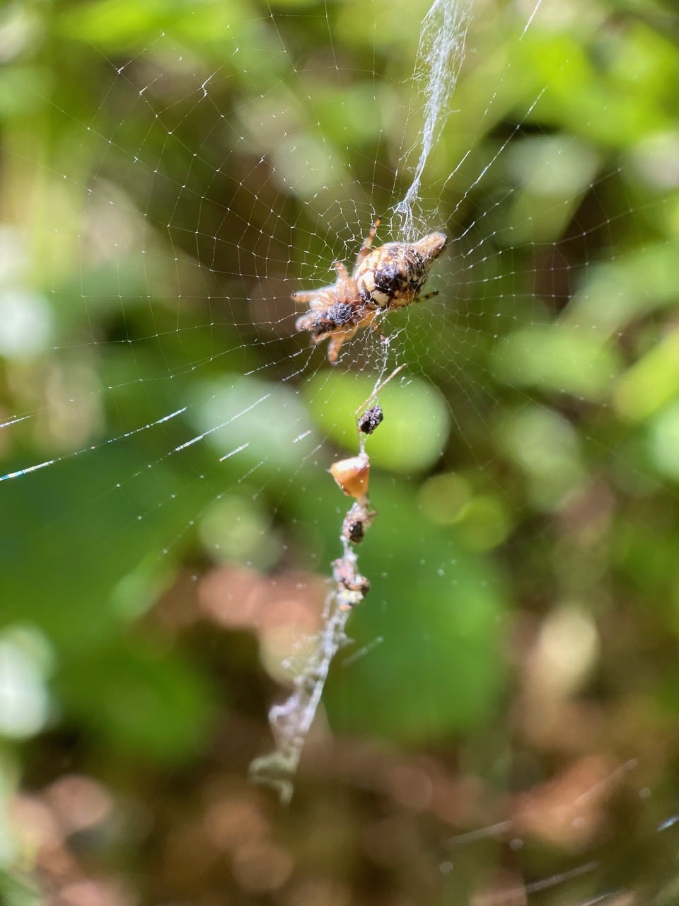 A female Conical Trashline Orbweaver, Cyclosa conica (family Araneidae) has attached a few items on the trashline on the lower half of her web – plant debris and prey carcasses. We are looking at her underside through the web.